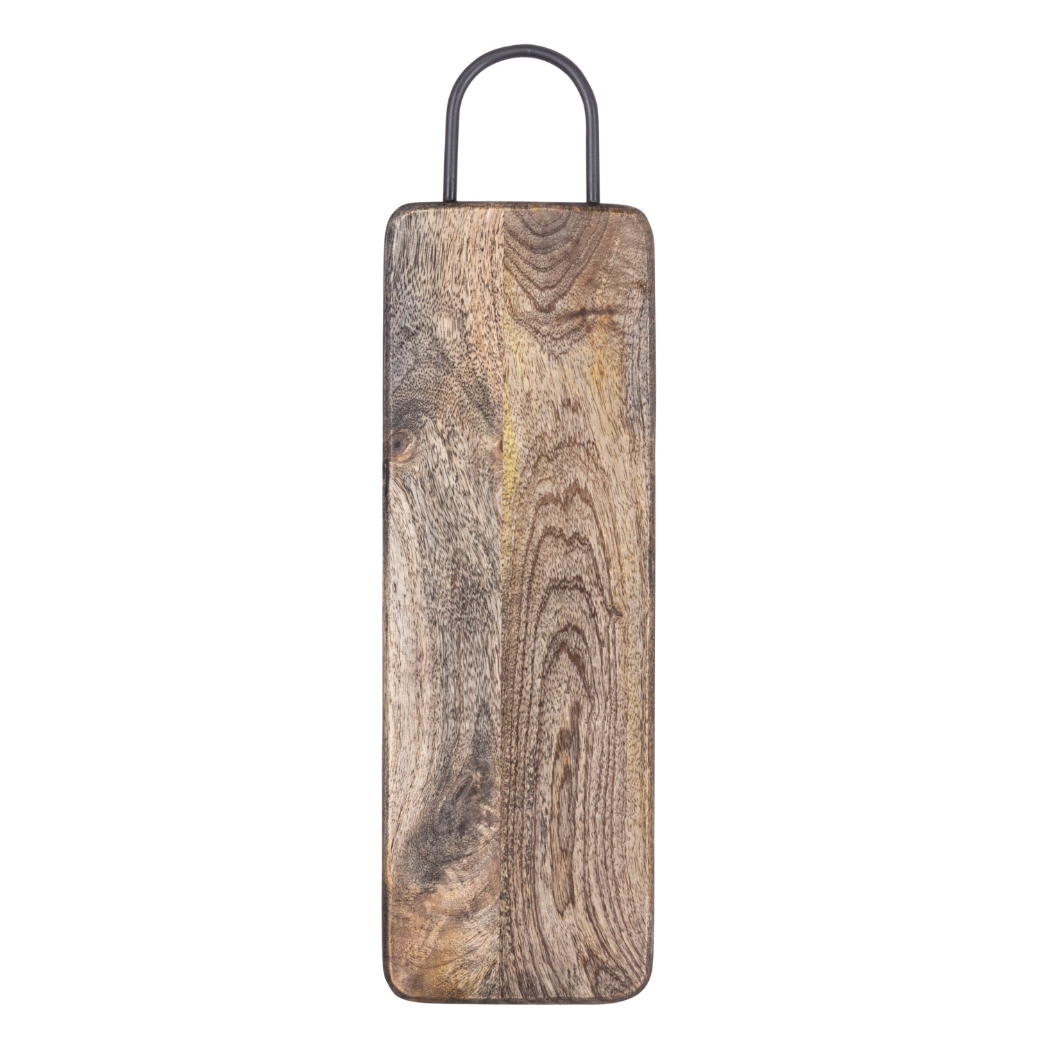 This mango wood cutting board with a metal handle is a stylish and functional accessory for the kitchen. It features a solid mango wood surface with a smooth and delicate texture and a walnut finish that adds a touch of warmth and elegance to the food presentation. The mango wood is also eco-friendly and sturdy, making it an ideal choice for any cutting needs. The cutting board also has a black metal handle that is attached to the board and adds contrast and a modern flair to the design. Use the handle to carry or hang the cutting board when not in use. Whether slicing or serving snacks, this cutting board will impress with its style and functionality. It measures 17.5 inches long and 5 inches wide, giving ample room to work with. This cutting board will make a great addition to the kitchen or a thoughtful gift for someone special. A stylish and functional cutting board made of solid mango wood with a walnut finish and a black metal handle. Ideal for adding a touch of Scandinavian, industrial and modern to the kitchen or dining table. Hand wash only with mild soap and water, and dry thoroughly. Made from mango wood and metal.