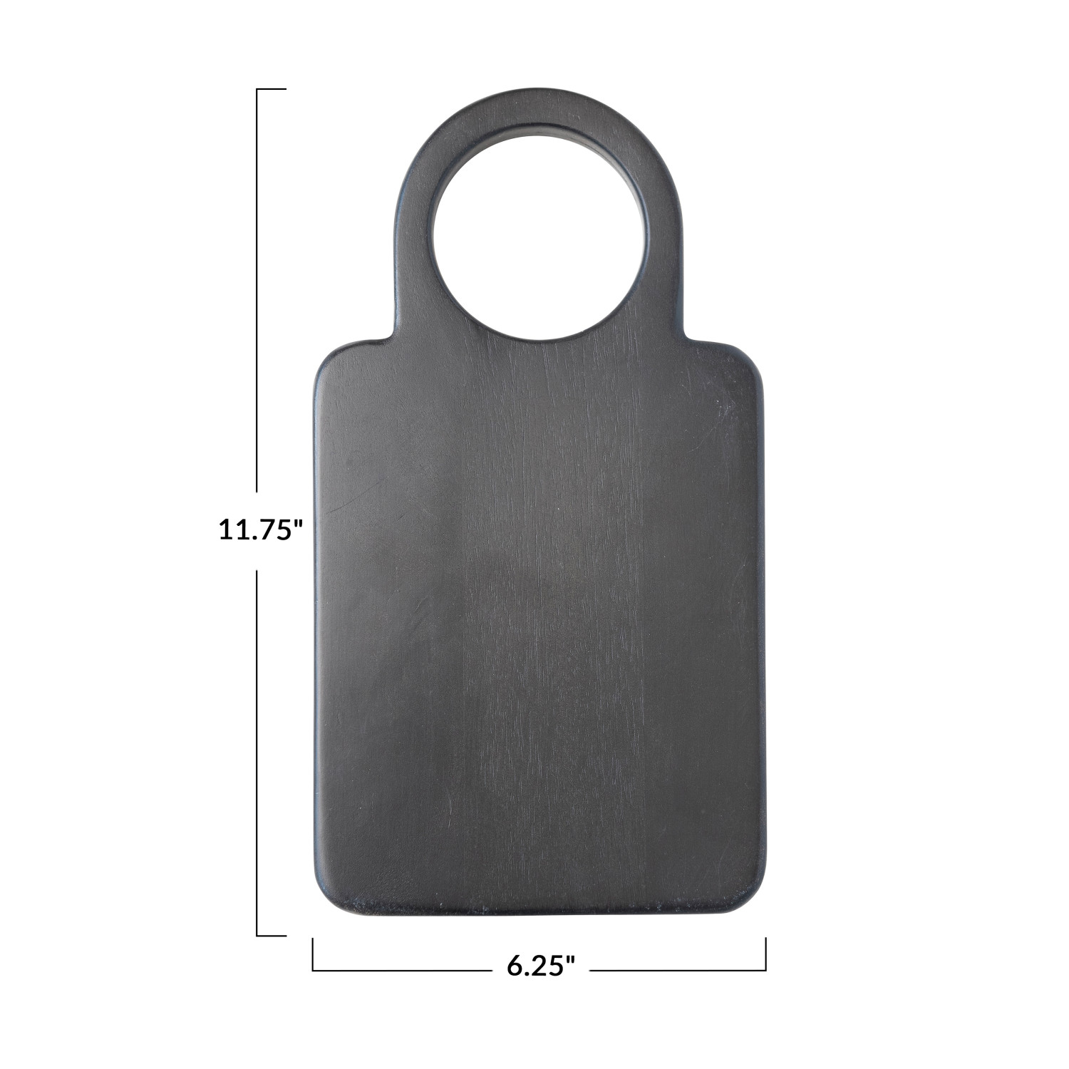 This mango wood cutting board with a round handle is a chic and functional accessory for the kitchen. It features a solid mango wood surface with a smooth and delicate texture and a black finish that creates a sleek and elegant look. The mango wood is also eco-friendly and sturdy, making it an ideal choice for any cutting needs. The cutting board also has a round handle that is integrated into the board, making it easy to carry and hang when not in use. Whether slicing cheese or serving snacks, this cutting board will impress with its style and functionality. It measures 11.75 inches long and 6.25 inches wide, giving ample room to work with. This cutting board will make a great addition to the kitchen or a thoughtful gift for someone special. A chic and functional cutting board made of solid mango wood with a black finish and a round handle. Ideal for adding a touch of farmhouse, industrial and rustic to the kitchen or dining table. Hand wash only with mild soap and water, and dry thoroughly. Made from mango wood.