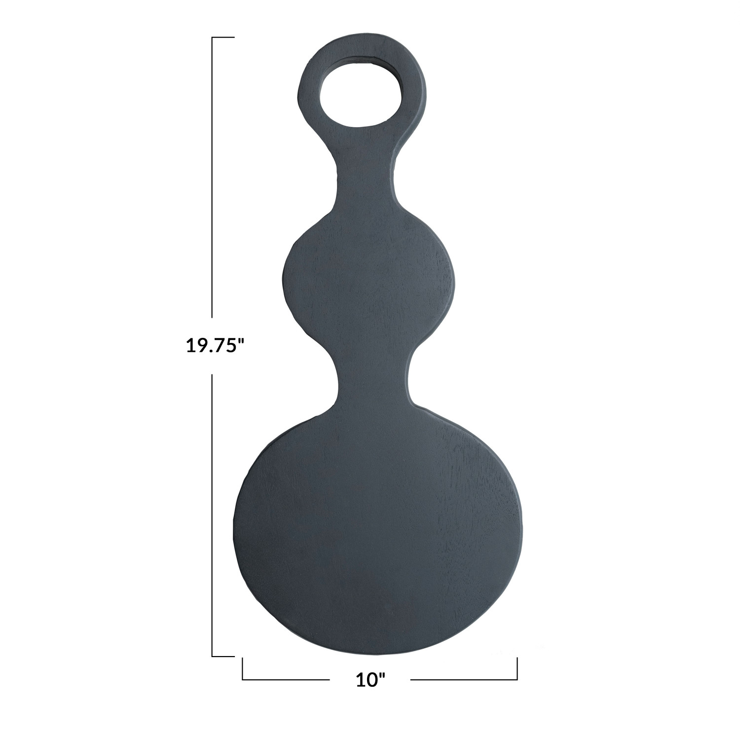 This Avant-Garde Mango Wood Cheese and Cutting Board is a fusion of functionality and modern art. At 19.75 inches long and 10 inches wide, its substantial surface is ideal for an array of cheeses and appetizers. The board's distinctive black hue and abstract shape, highlighted by three lined circles, make it a conversation starter at any event. The round handle ensures comfort and control while presenting varied culinary creations. Handcrafted from mango wood, this board is not only a practical kitchen accessory but also a piece of decor that stands out in any setting. Whether used for preparation or presentation, it's a board that celebrates love for unique design and fine food.