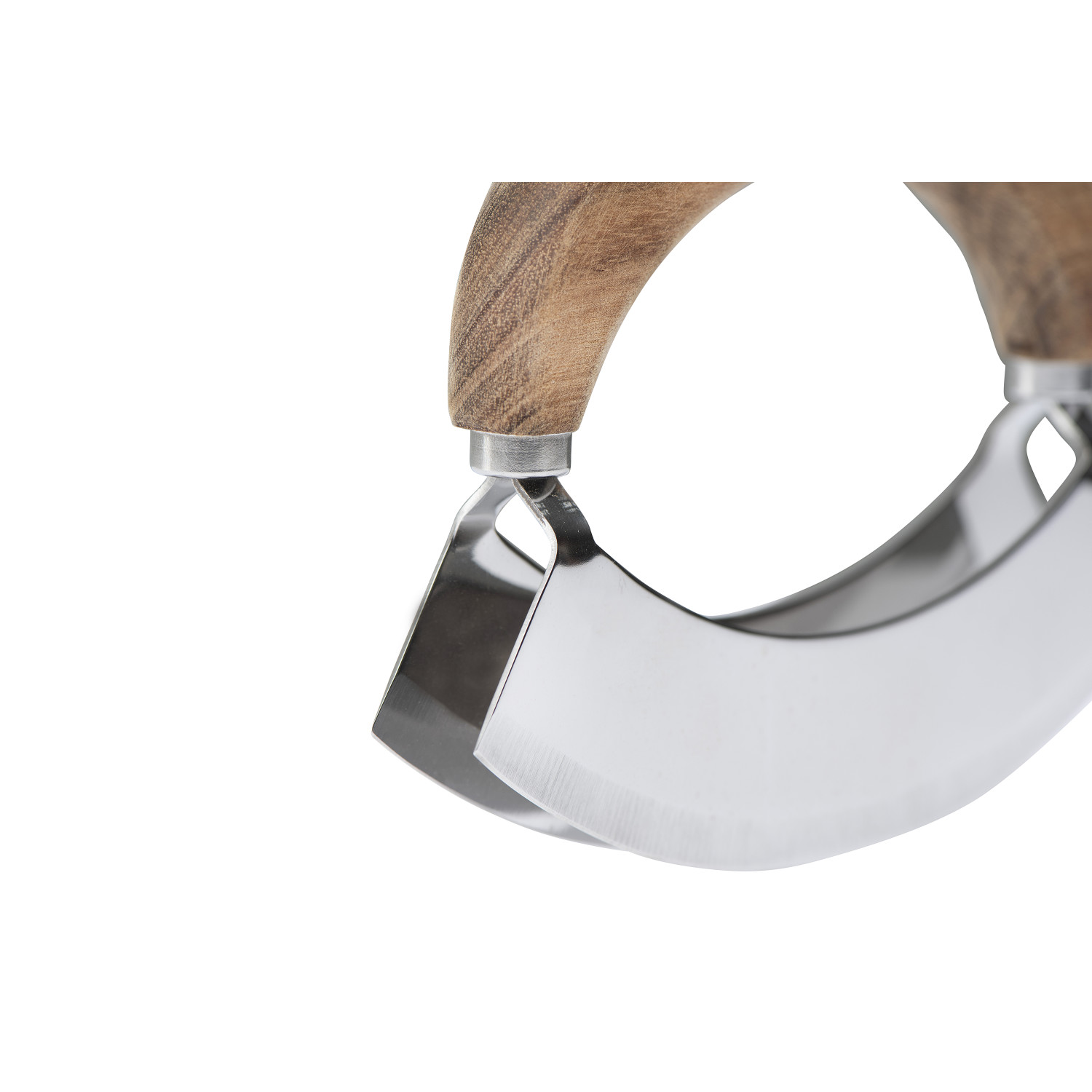 Italian for "half-moon" a mezzaluna knife uses a smooth rocking motion to evenly chop large piles of veggies, nuts or fresh herbs. The cutting board has a carved out center for holding contents in place while the mezzaluna features a large handle for a comfortable grip. Create fun in the kitchen by cutting with this wonderful double bladed set.