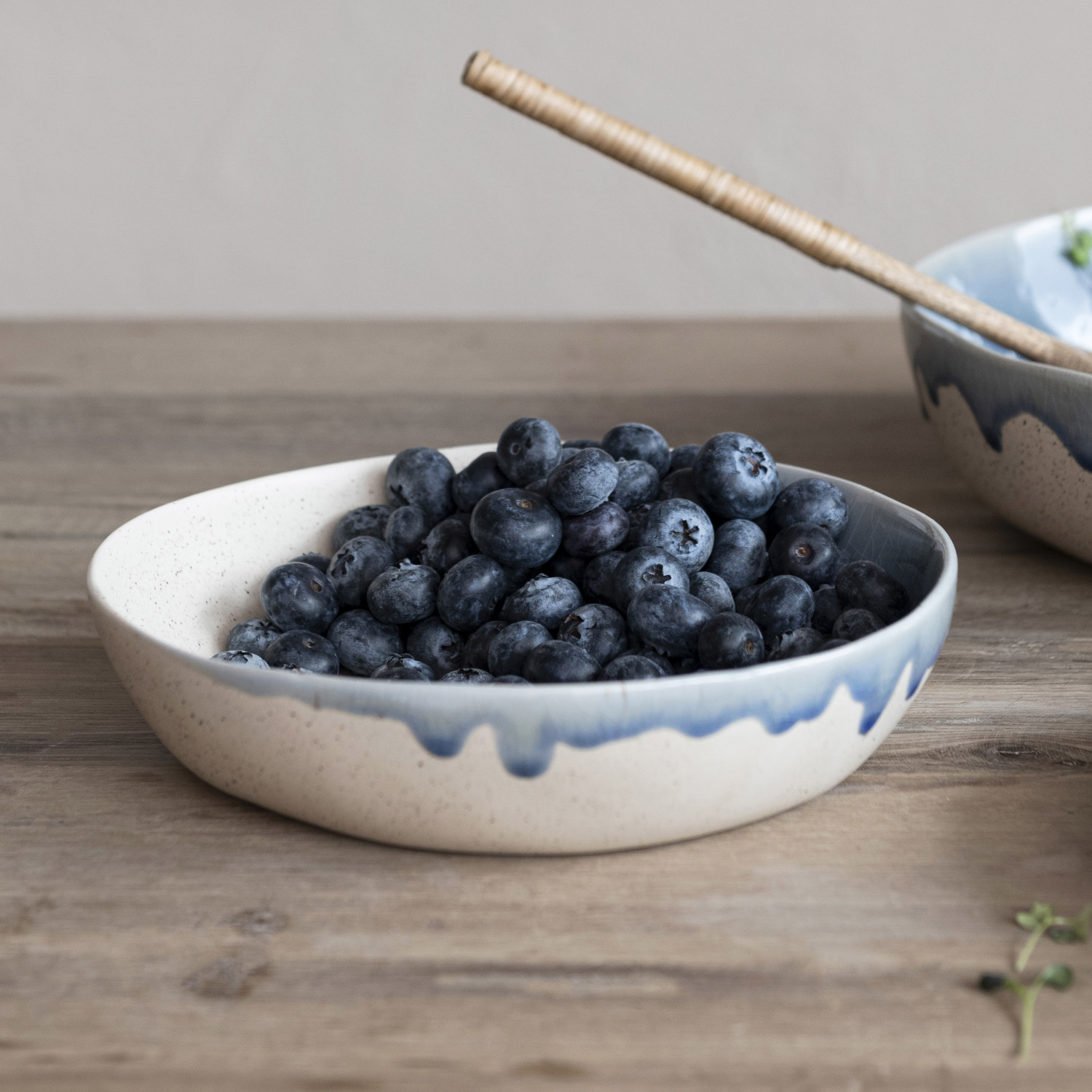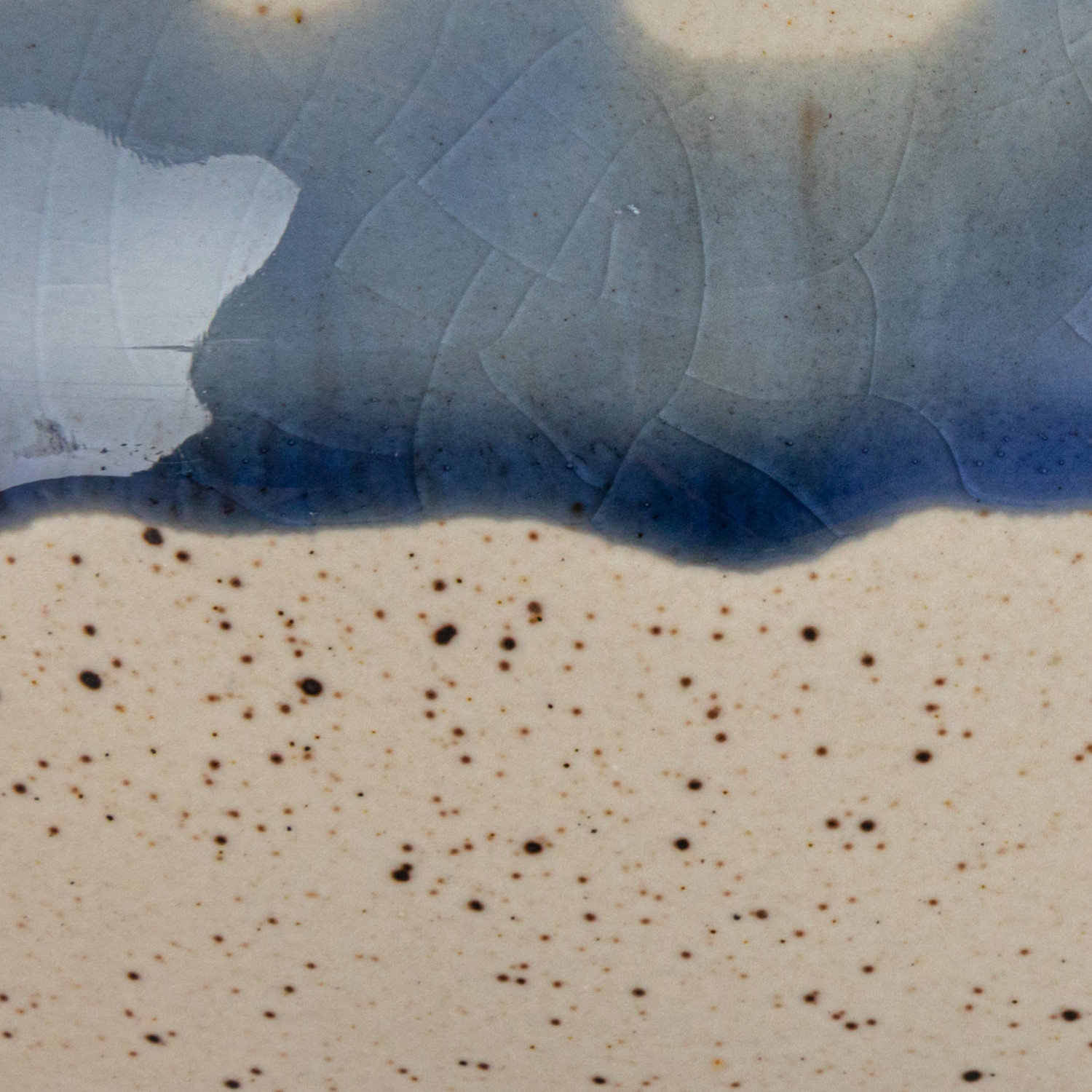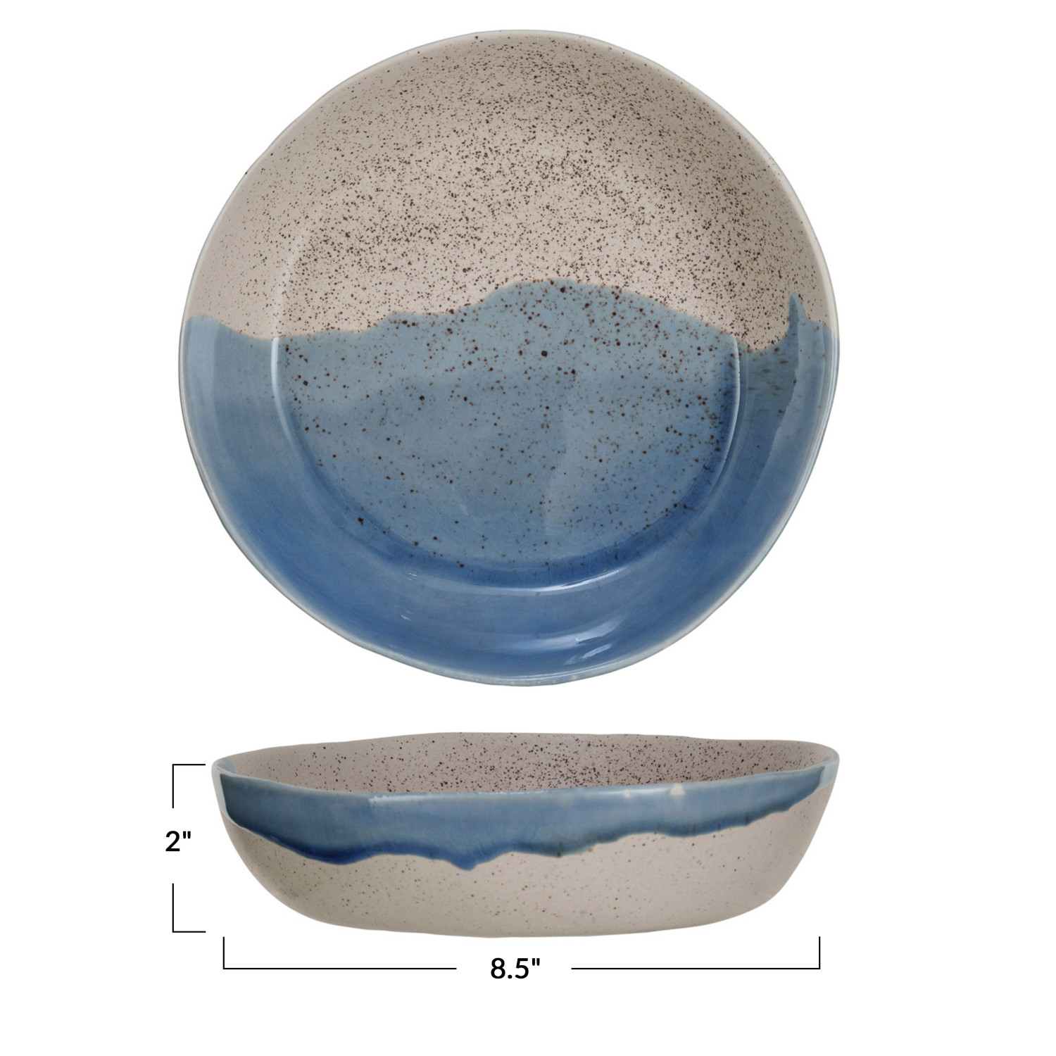 Catalog Name: 8-1/2" Round x 2"H Stoneware Bowl, Reactive Crackle Glaze, Blue & Cream Color Speckled (Each One Will Vary)