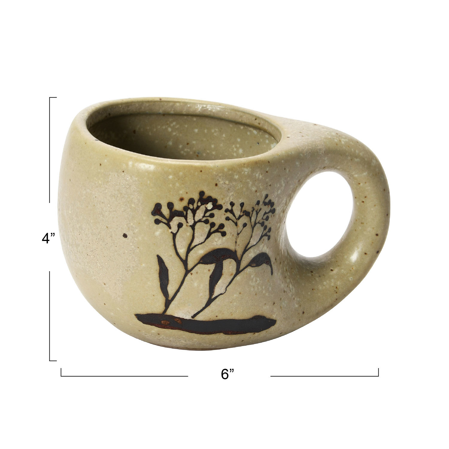 Catalog Name: 3-3/4" Round x 3-1/2"H 12 oz. Stoneware Mug w/ Wax Relief Floral Image, Reactive Glaze, Tan Color Speckled & Brown (Each One Will Vary)