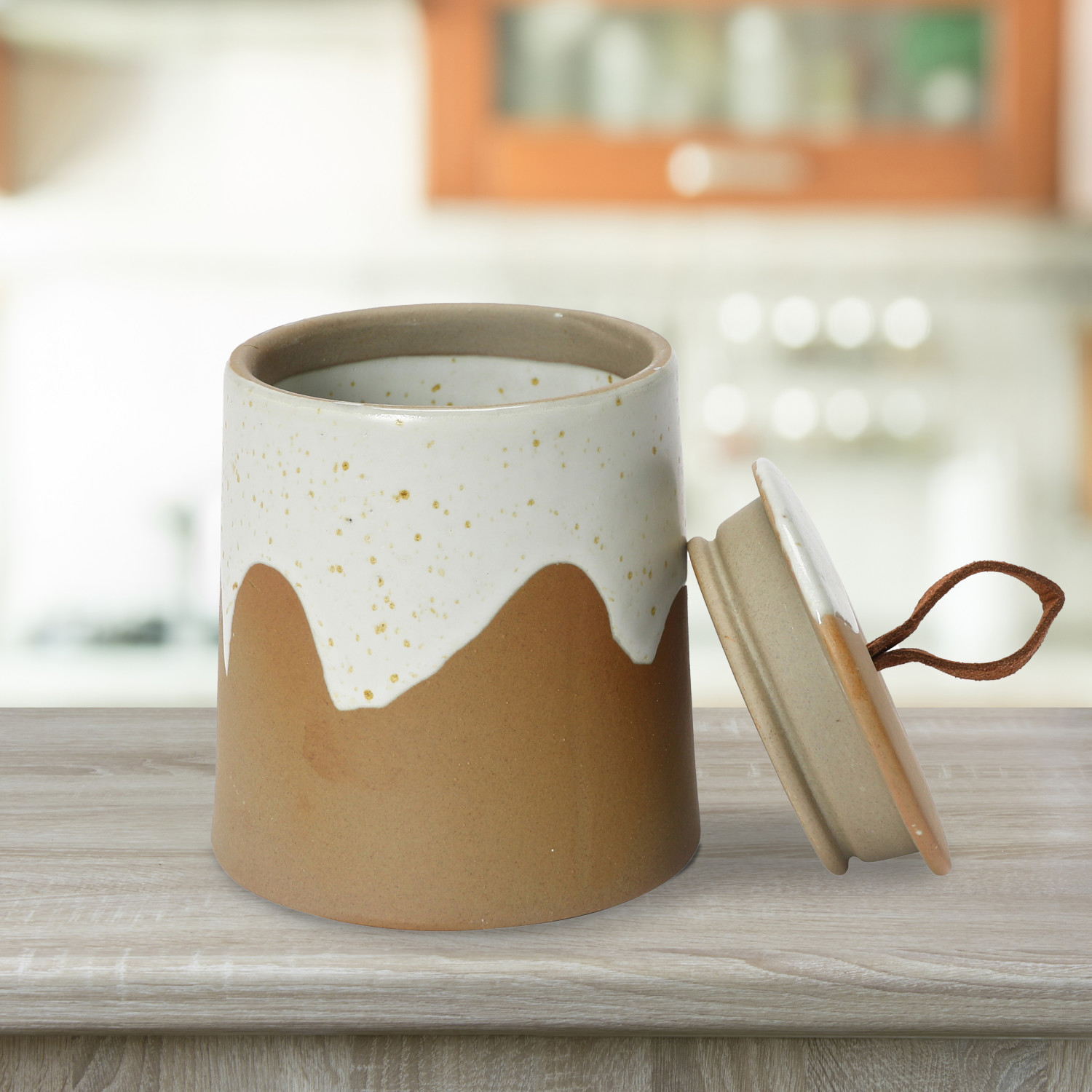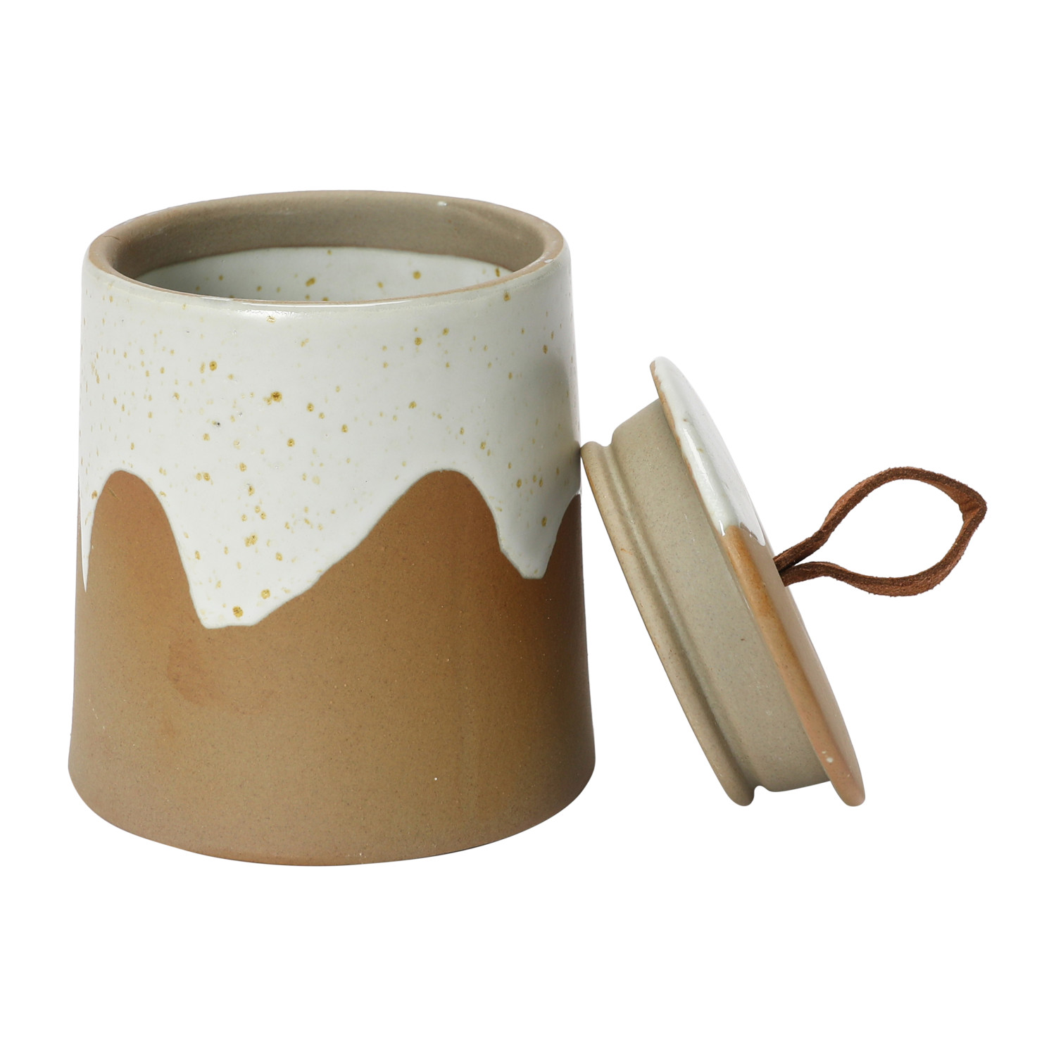This stunning stoneware canister showcases a naturally variating 2-tone reactive glaze and rustic leather loop.