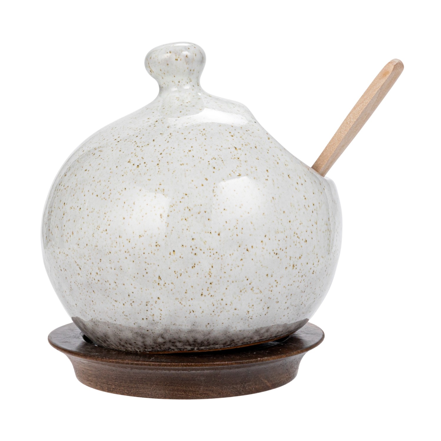 Catalog Name: 4-3/4" Round x 5-1/2"H Stoneware Salt Jar w/ Wood Spoon & Base, Reactive Glaze, White Speckled, Set of 3 (Each One Will Vary)
