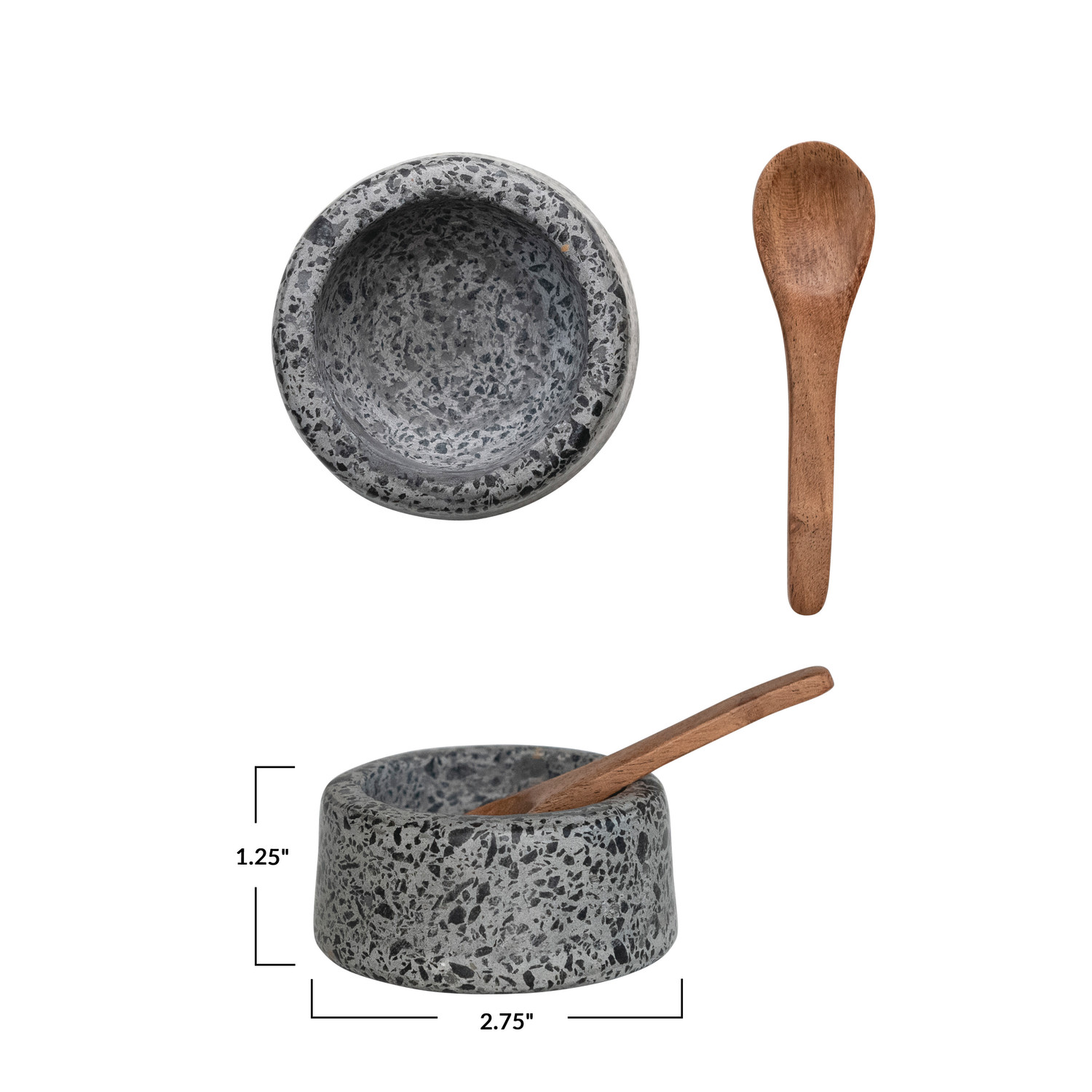 Catalog Name: 2-3/4" Round x 1-1/4"H Terrazzo Salt Cellar w/ Acacia Wood Spoon, Grey & Natural, Set of 2