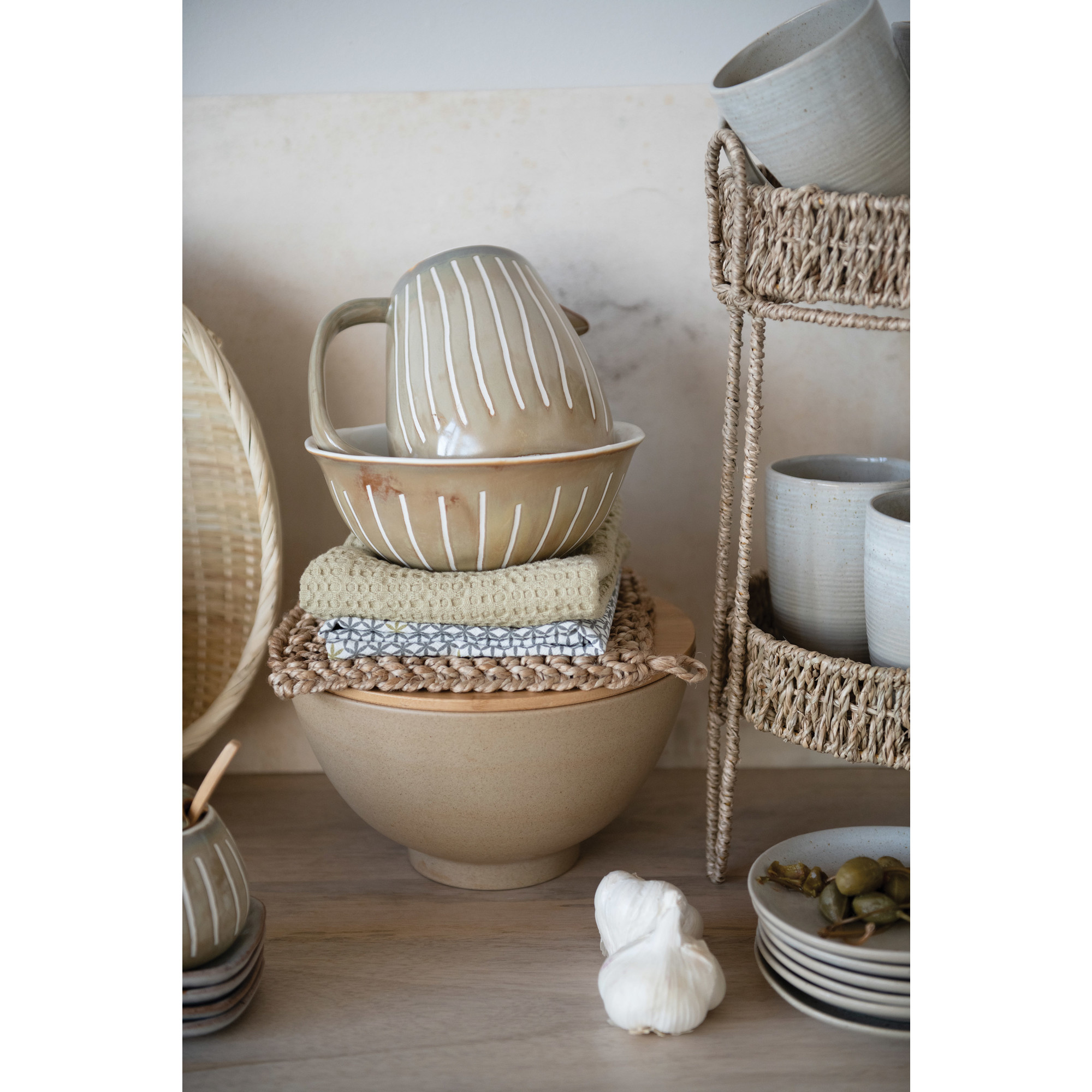 Catalog Name: 7-1/2"L x 5-1/4"W x 6-3/4"H 32 oz. Stoneware Pitcher w/ Debossed Lines, Reactive Glaze, Sage Color & White (Each One Will Vary)