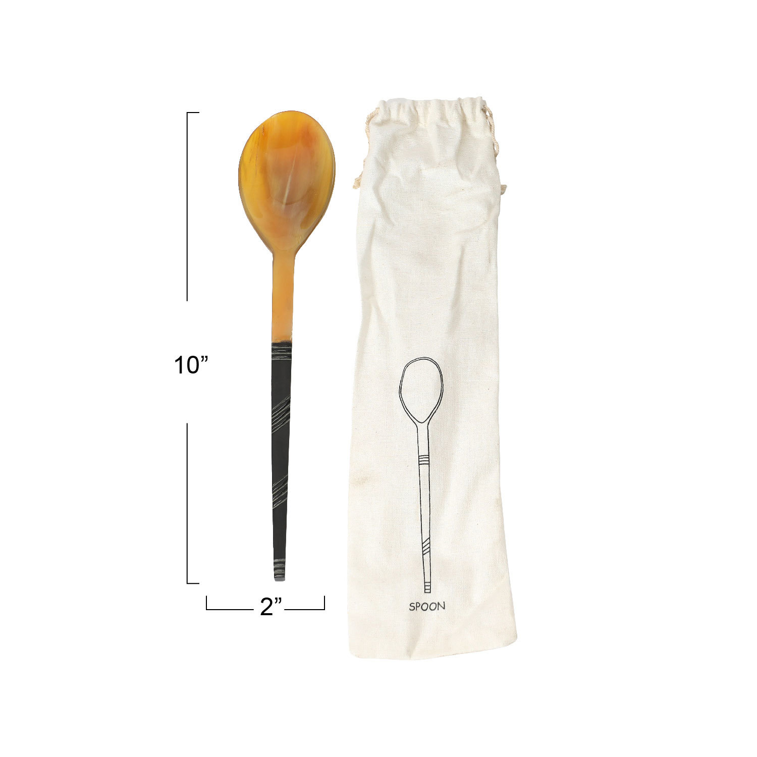 Catalog Name: 10"L Natural Horn Serving Spoon in Printed Drawstring Bag (Each One Will Vary)