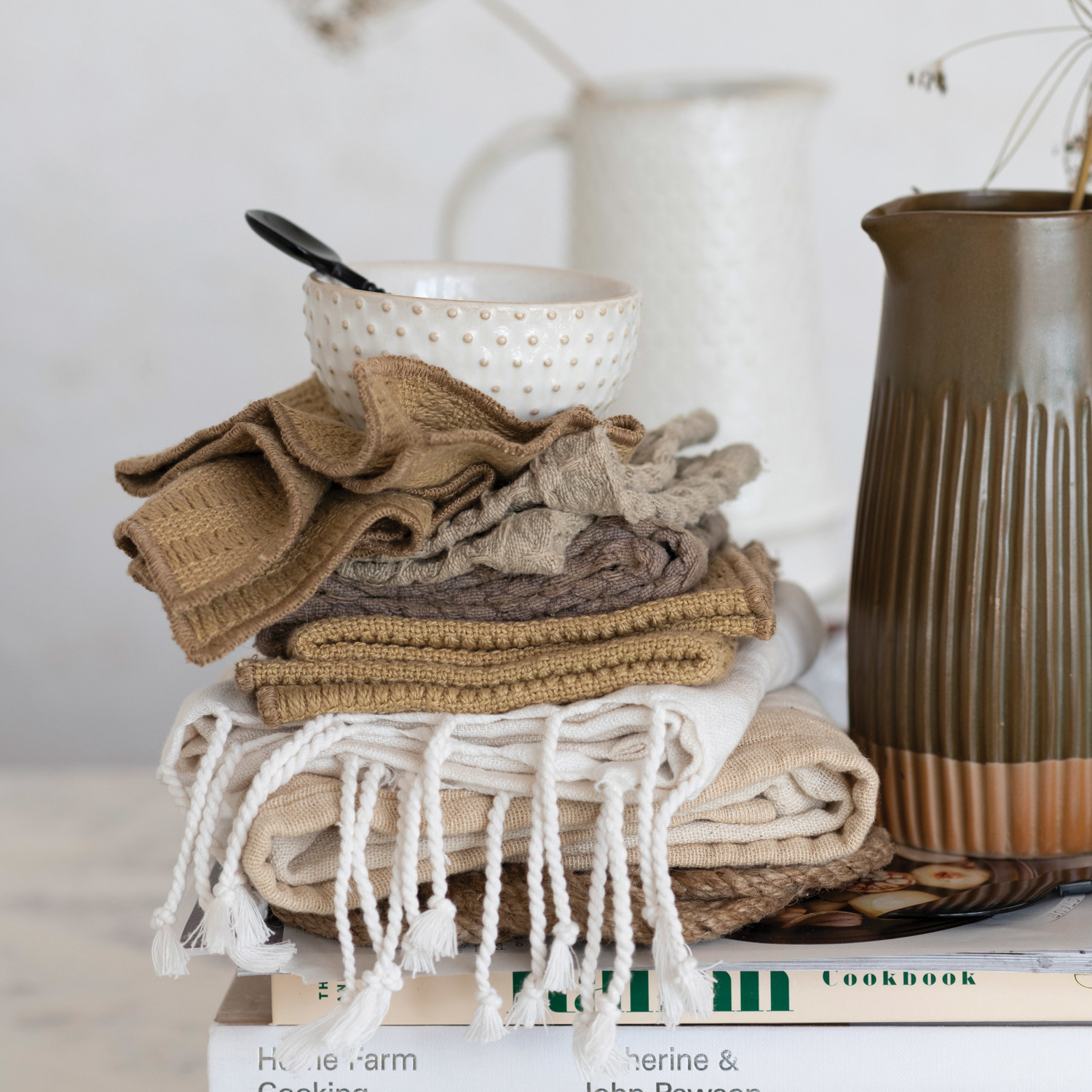 This modern boho stoneware pitcher showcases an intricately carved ribbed design and naturally variating reactive glaze.