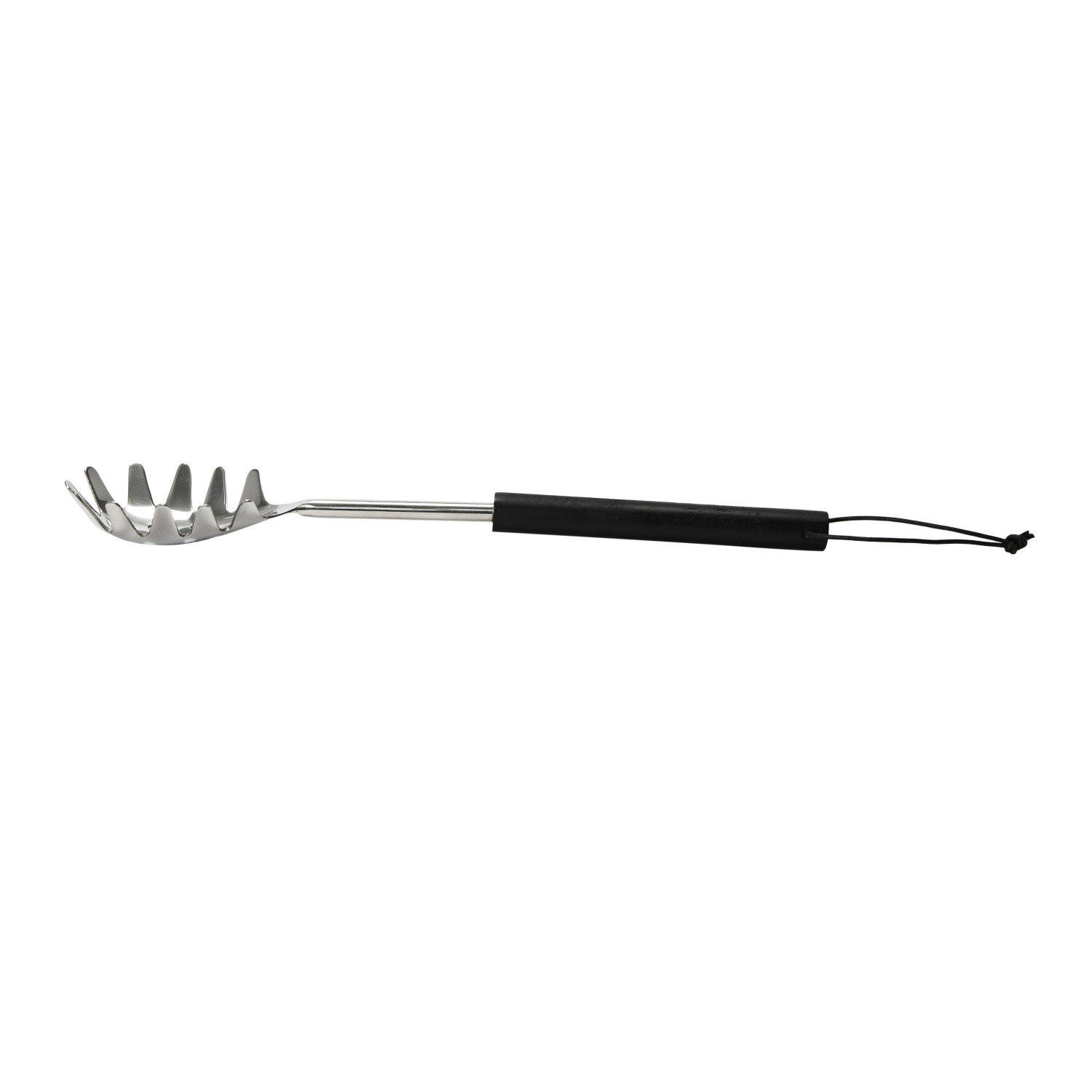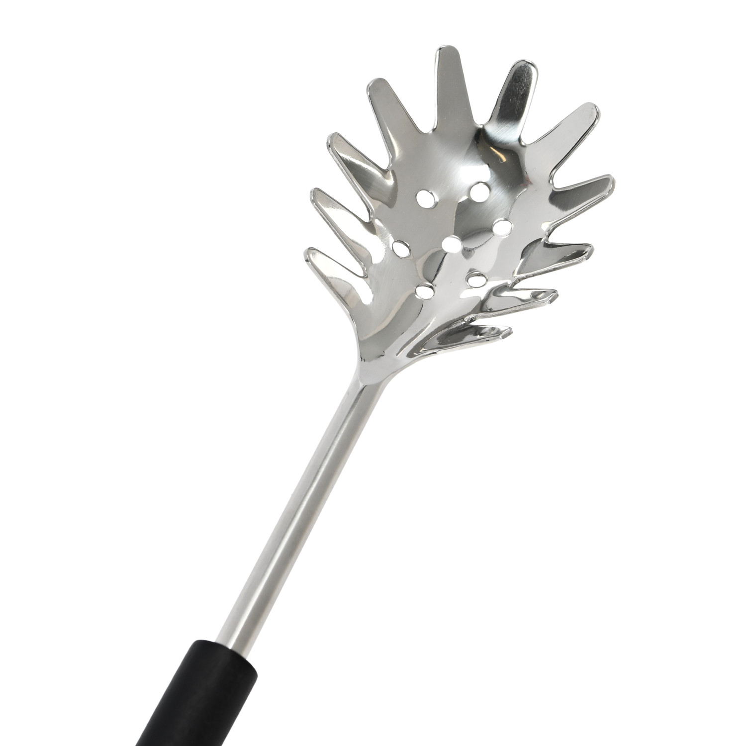 This elegant pasta server features sleek stainless steel construction finished with a black mango wood handle and leather tie.