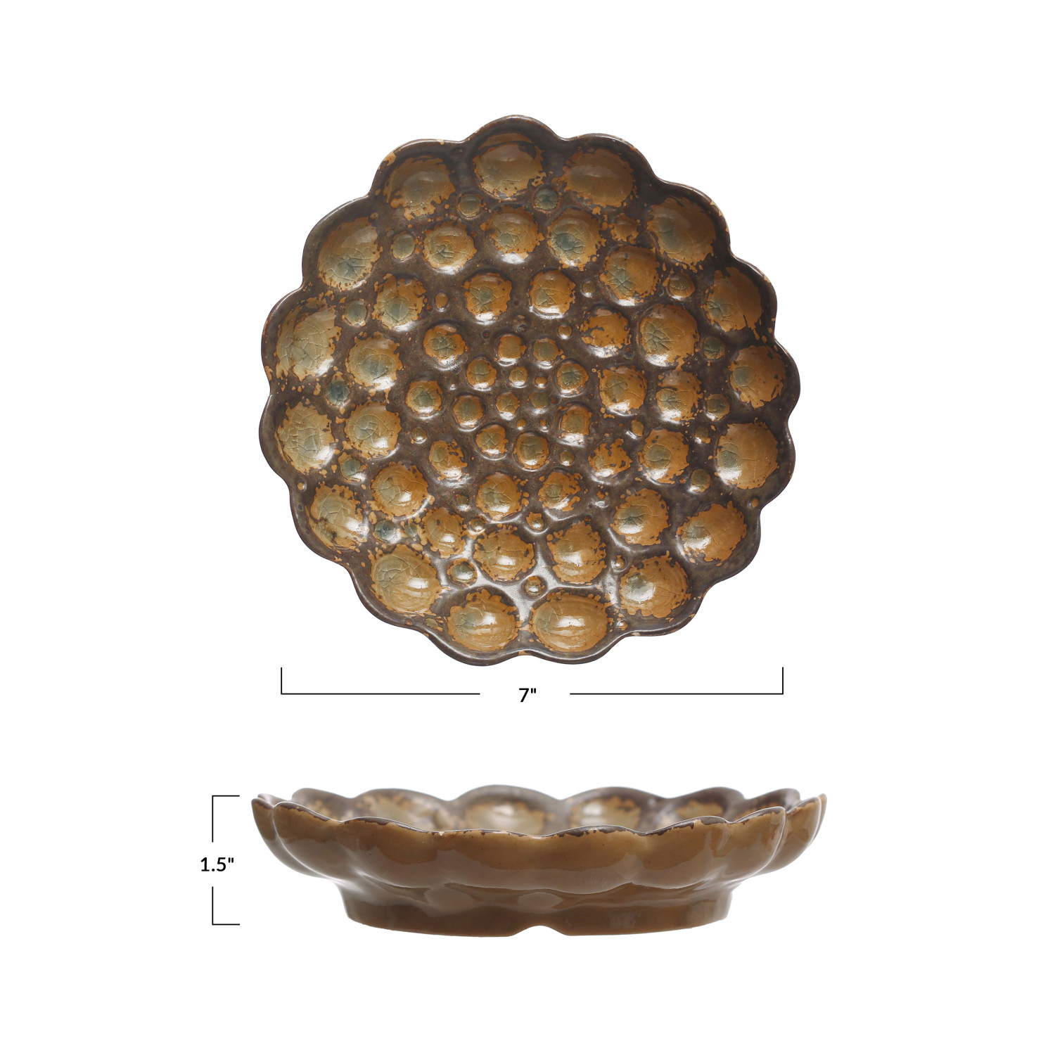 Catalog Name: 7" Round x 1-1/2"H Stoneware Formed Plate w/ Scalloped Edge, Reactive Glaze, Brown (Each One Will Vary)