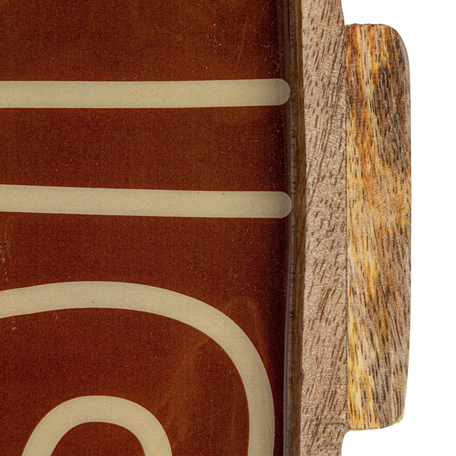 This Abstract Elegance Mango Wood Tray is a versatile addition to any home. The enameled surface, adorned with abstract lines, creates a visual feast that complements the tray's practicality. Its food-safe quality makes it perfect for presenting everything from appetizers to desserts. The brown, cream, and natural color palette exudes a warm, inviting vibe, while the built-in handles ensure comfortable transport. With dimensions of 15.00 inches in length, and 9.75 inches in width, it's sized just right for intimate gatherings or everyday use, making it as functional as it is beautiful.