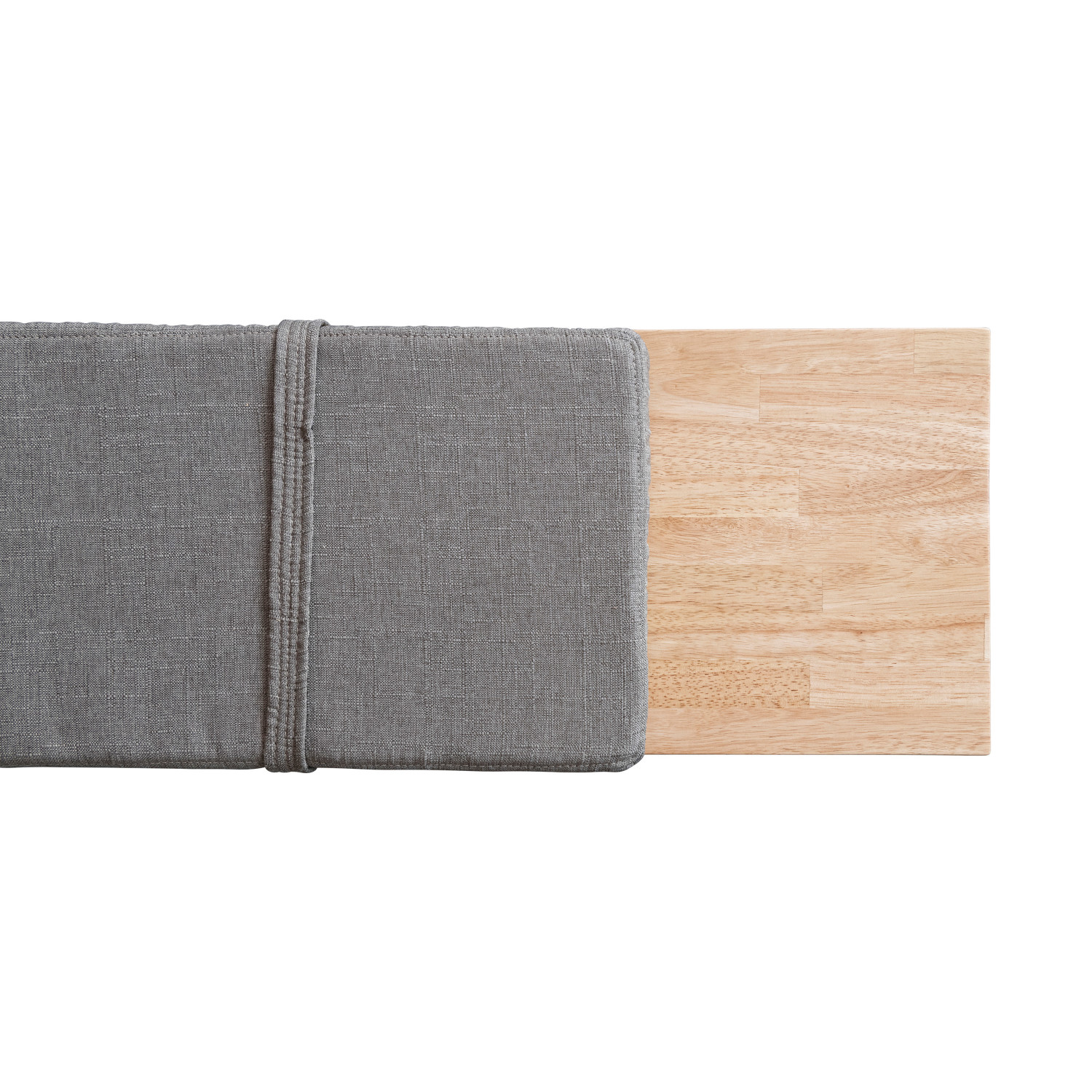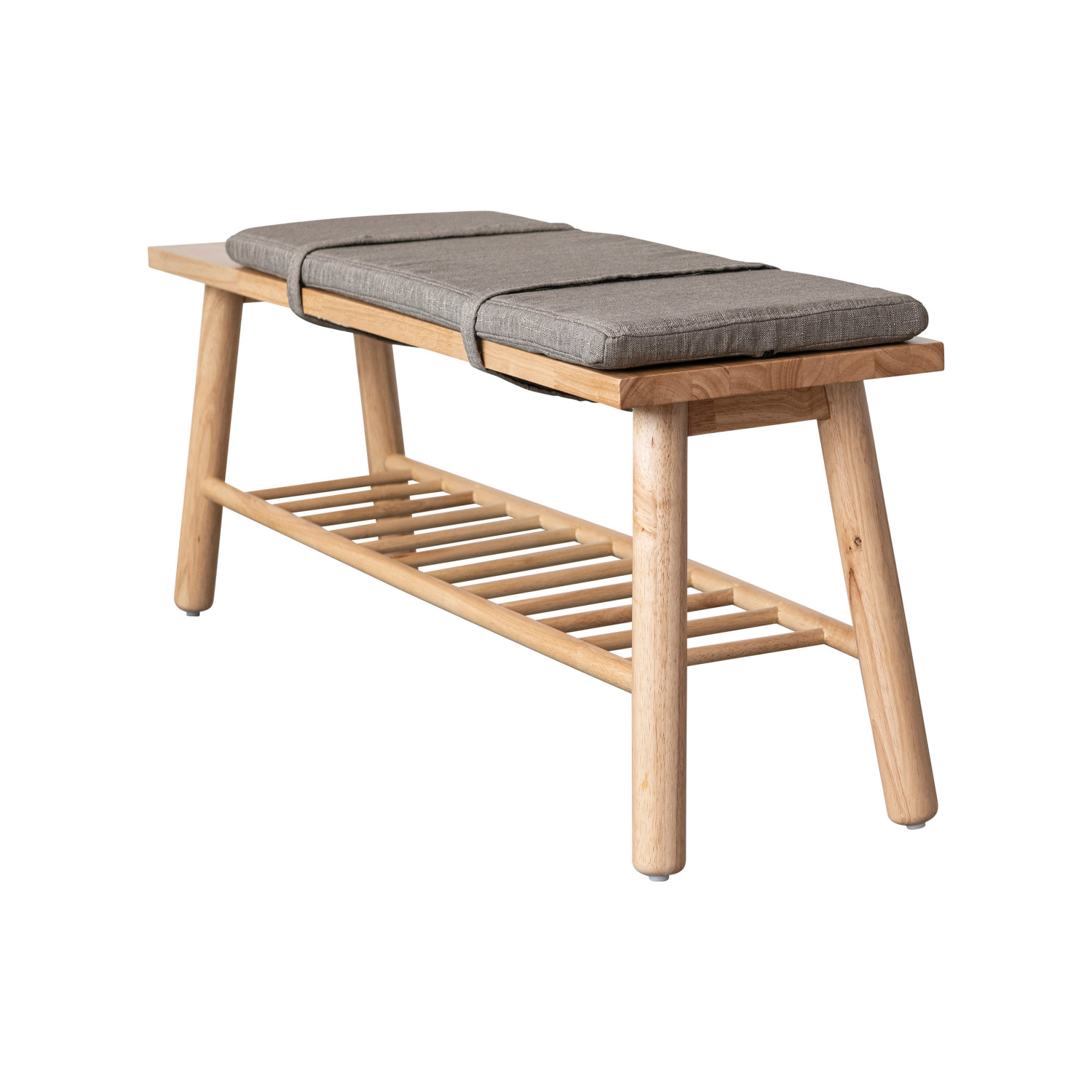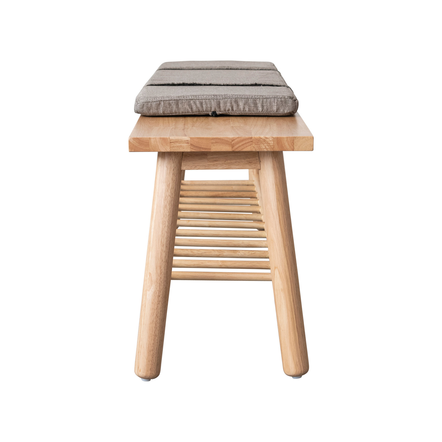 This grey fabric upholstered rubberwood bench with shelf and cushion is a functional and stylish addition to the home. The grey fabric cushion provides a soft and comfortable feel, while the natural rubberwood frame and shelf add a rustic and elegant touch. The bench is ideal for adding a touch of Scandinavian, boho, global, or modern simplicity to any space. Use it as a comfortable and versatile bench, ottoman, or coffee table in the living room, bedroom, or entryway. The bench comes partially assembled with easy-to-follow instructions. The cushion is made of soft and durable fabric and the frame and shelf are made of solid and sturdy rubberwood.