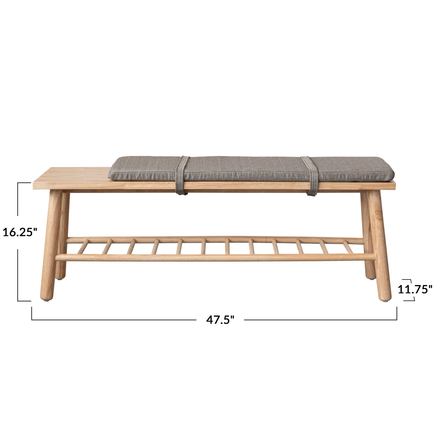 Catalog Name: 47-1/2"W x 11-3/4"D x 16-1/4"H Rubberwood Bench w/ Slatted Shelf & Removable Cushion, Natural & Grey, Truck Ship