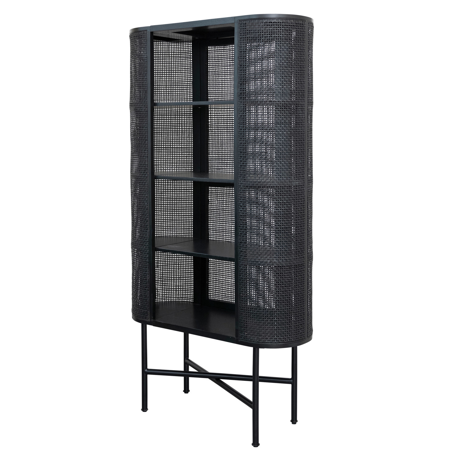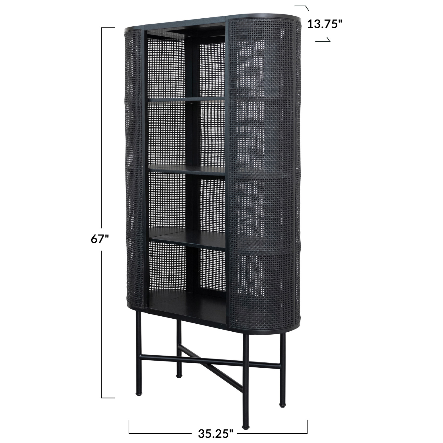 Catalog Name: 35-1/4"W x 13-3/4"D x 67"H Oval Woven Cane & Beech Wood Cabinet w/ 4 Shelves, Black, KD, Truck Ship