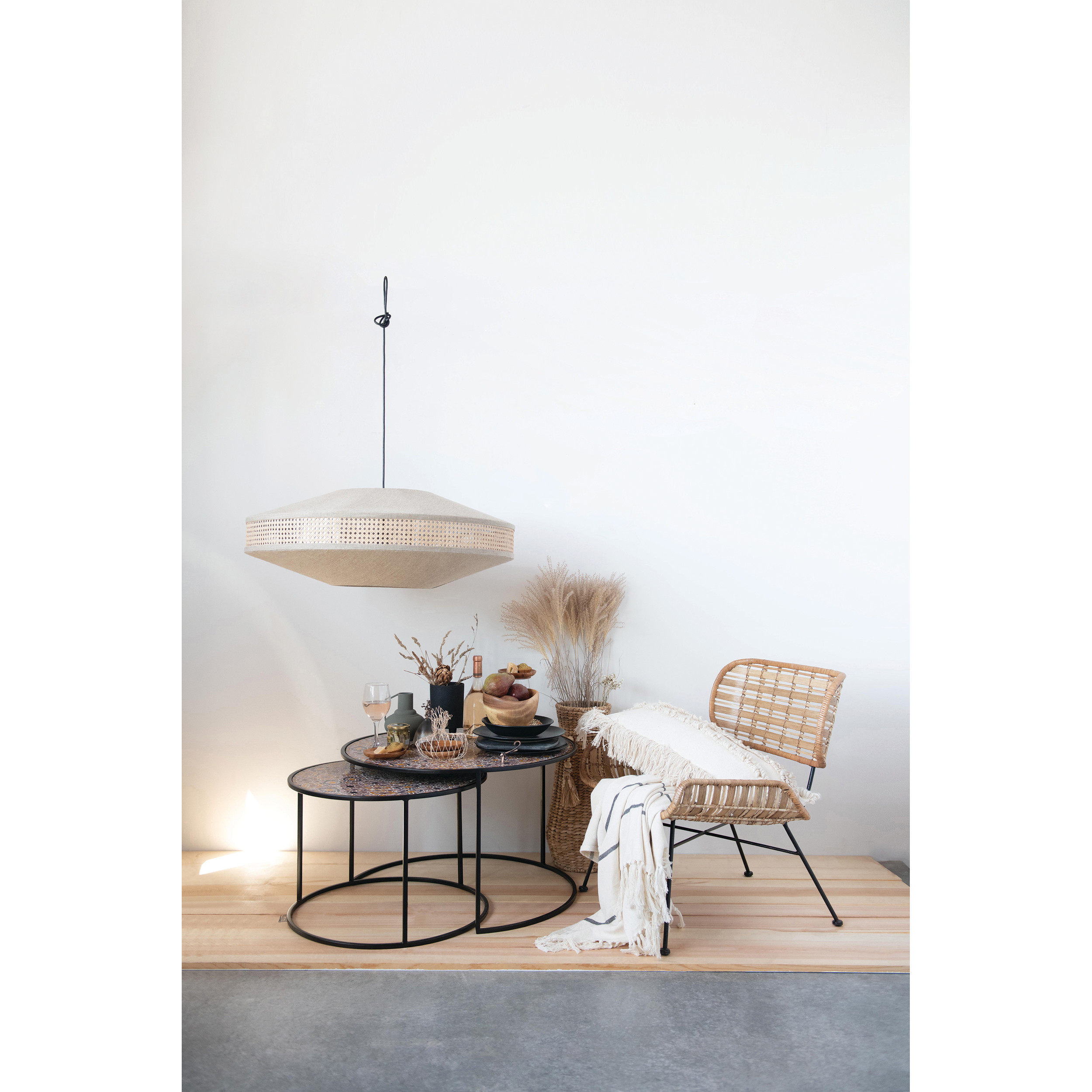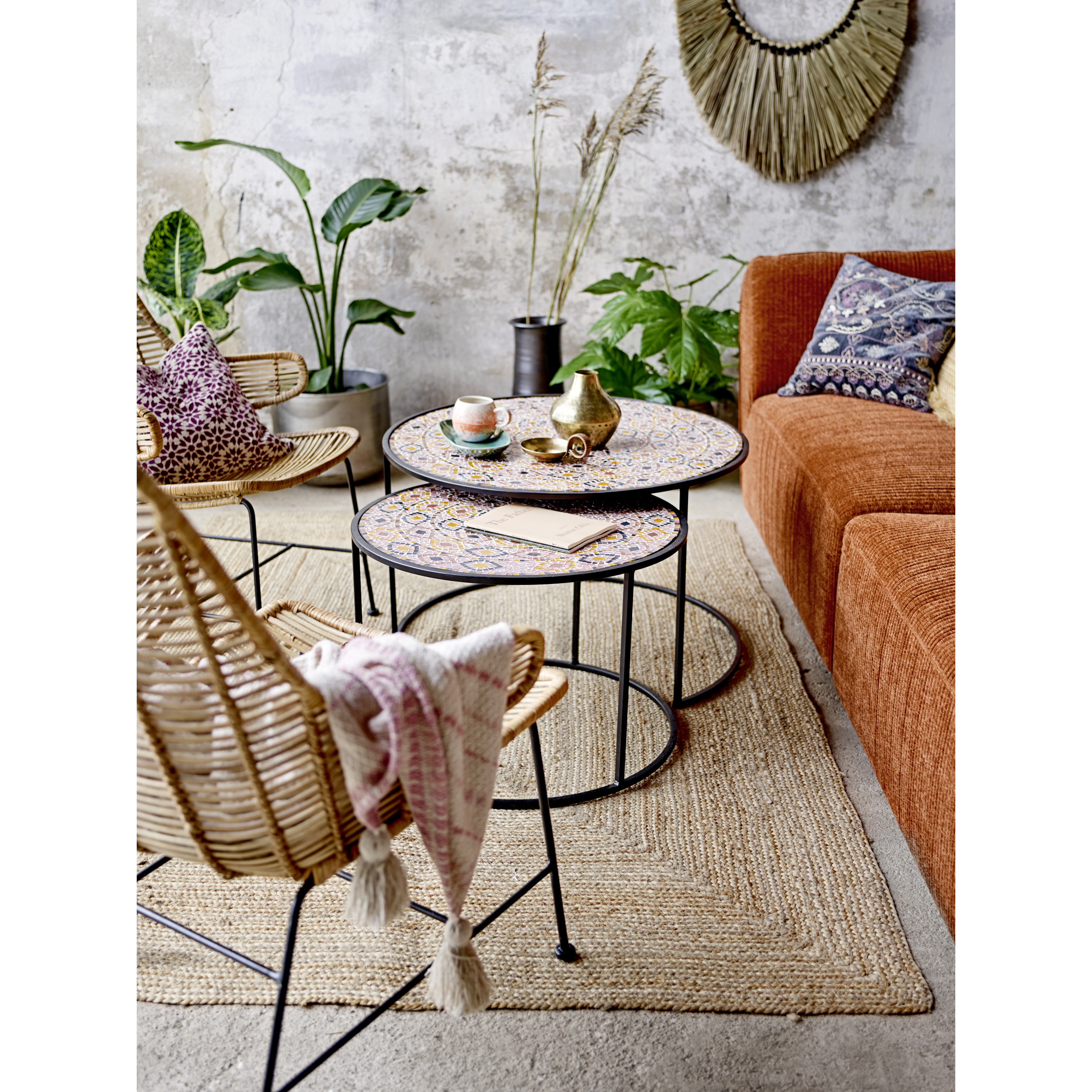 Adjustable table space is a lifesaver in many instances. This metal set of nesting tables features handmade mosaic glass tops. Place them together in the middle of two decorative chairs. The large 29 inch round table provides plenty of space for a lamp and other necessities. When adding a snack, books or other temporary items, pull the smaller table out for an additional 23 inches of tabletop surface.
