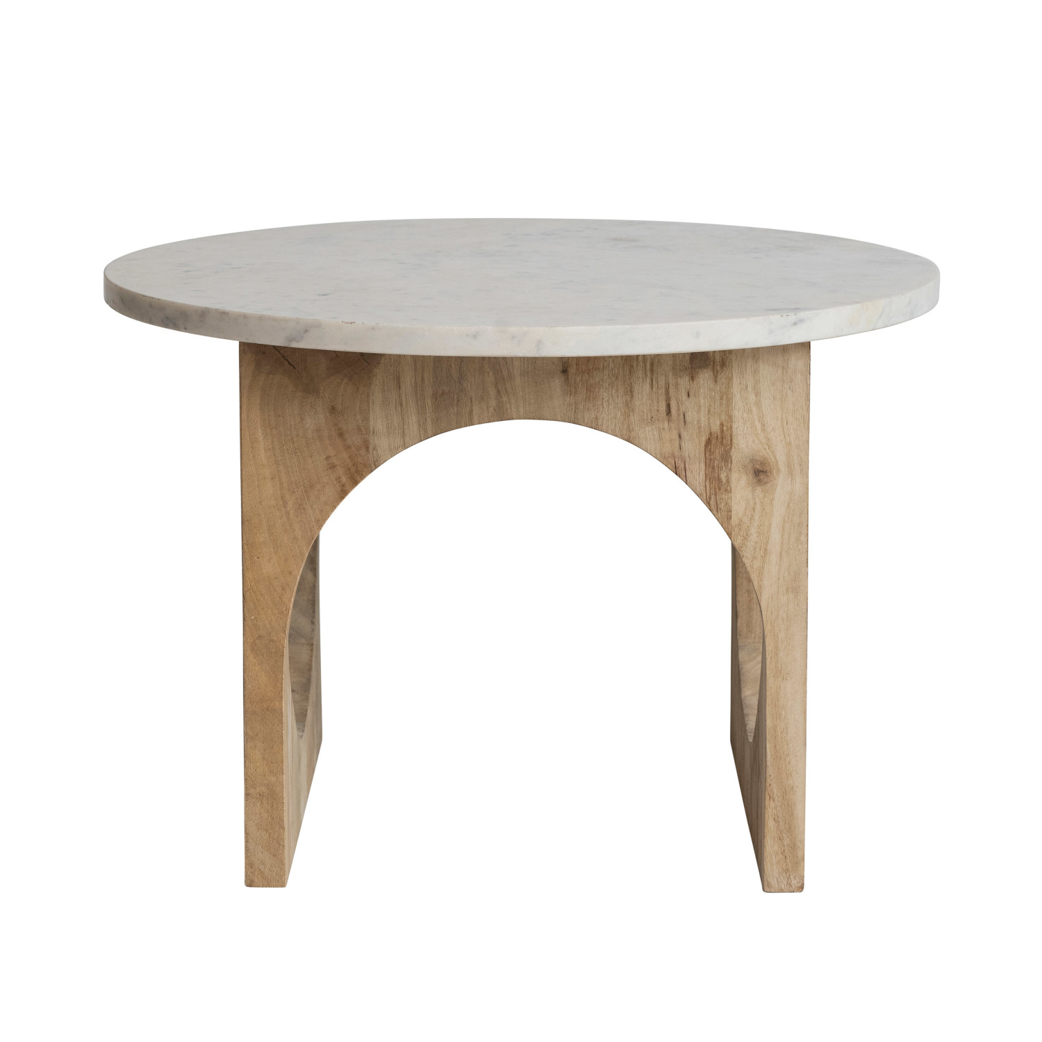 This mango wood table with a marble top adds sophistication and style to any space. It has a round marble top that is smooth and glossy, giving it a luxurious and refined look. The marble top is easy to clean and resistant to stains and scratches, ideal for holding drinks, snacks, books, or décor items. The table has a mango wood base that is sturdy and durable, with a natural color and texture that contrasts with the marble top. The base has four legs that are slightly tapered and curved, adding flair and elegance to the design. The table measures 23.5 inches in diameter and 16 inches in height and has a weight capacity of 66 pounds. It can serve as a coffee table, an accent table, or a side table in any room. It complements modern, glam, or transitional style homes with its stunning and elegant design. This mango wood table with a marble top is a beautiful and functional piece of furniture that enhances any space with its sophistication and style. A stunning and elegant table with a round marble top and a mango wood base. A great choice for modern, glam, or transitional-style homes. Features a smooth and glossy marble top that is easy to clean and resistant to stains and scratches. Made of mango wood and marble for durability and quality.