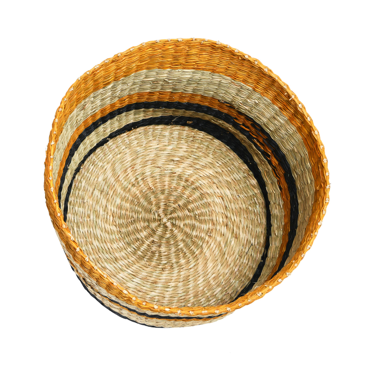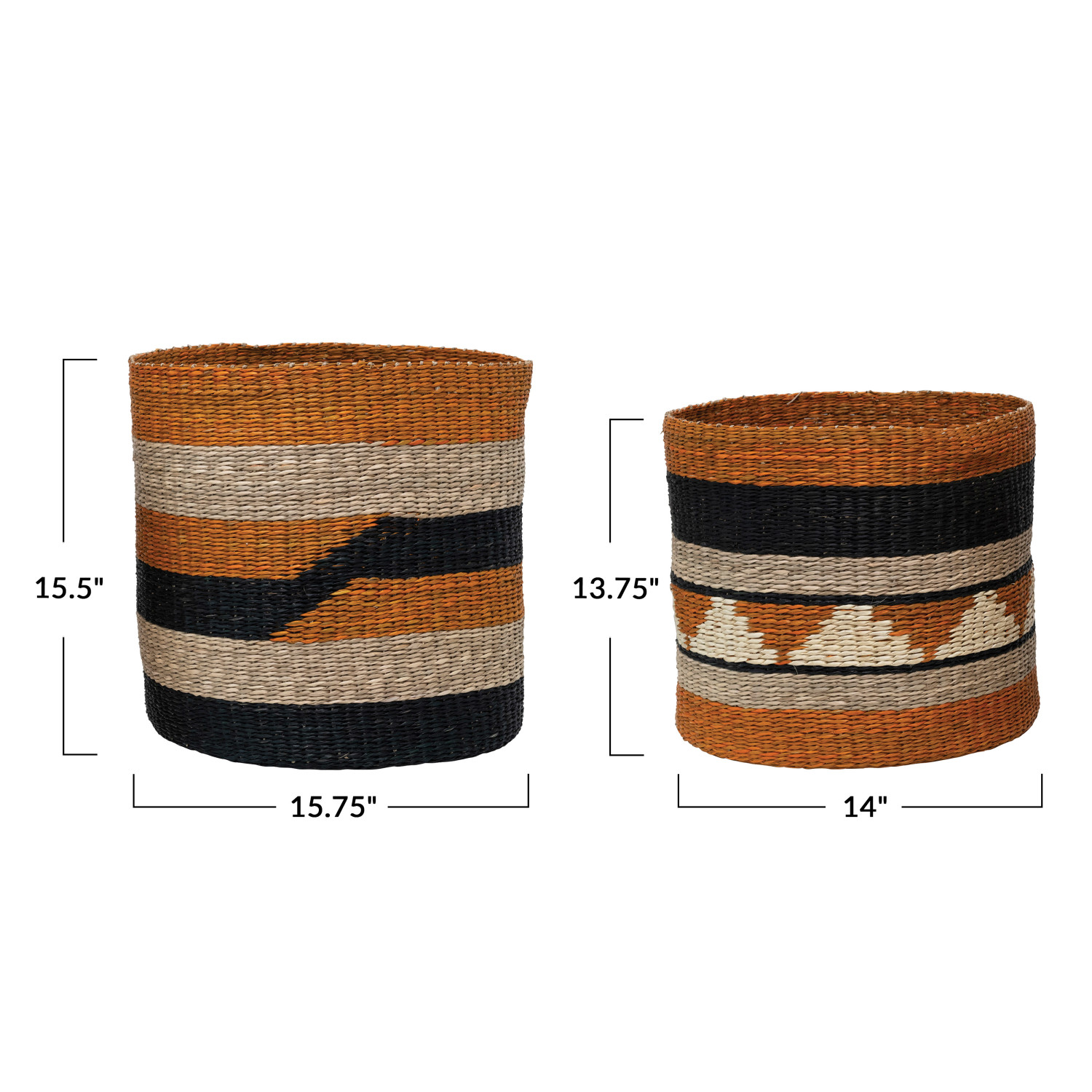 This bold set of decorative baskets showcases intricately hand-woven seagrass construction in multiple rich contrasting hues. Set of 2 multi-tone woven seagrass baskets. Add a dash of boho charm to any living space with these stylishly versatile baskets. Made from 100% seagrass.