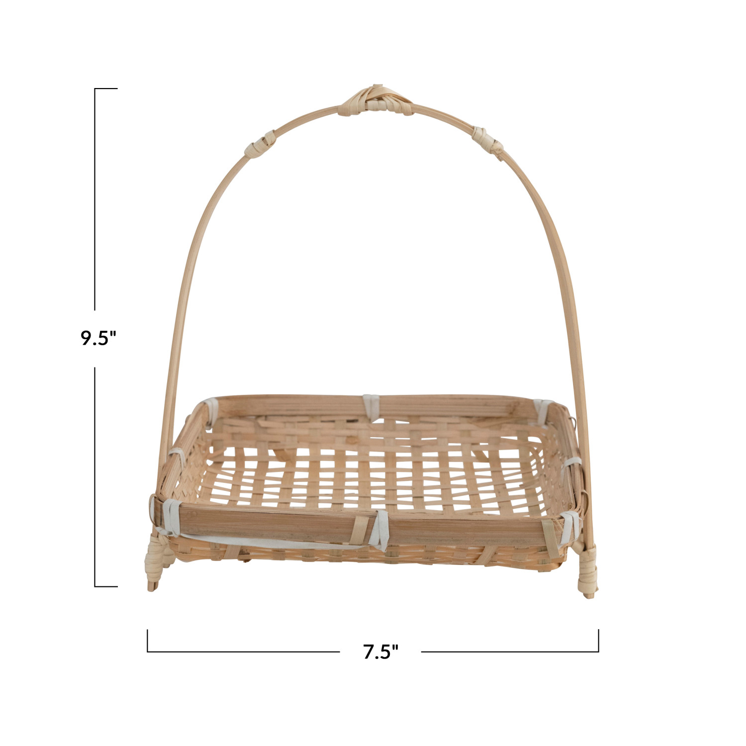 This contemporary boho stand with removable tray showcases organically hand-woven construction and a bold rounded handle. Hand-woven bamboo stand with handle and removable tray. Add a dash of boho charm to any living space with this stylishly versatile stand with tray. Arrange treasured trinkets or small plants for a delightfully eclectic display.