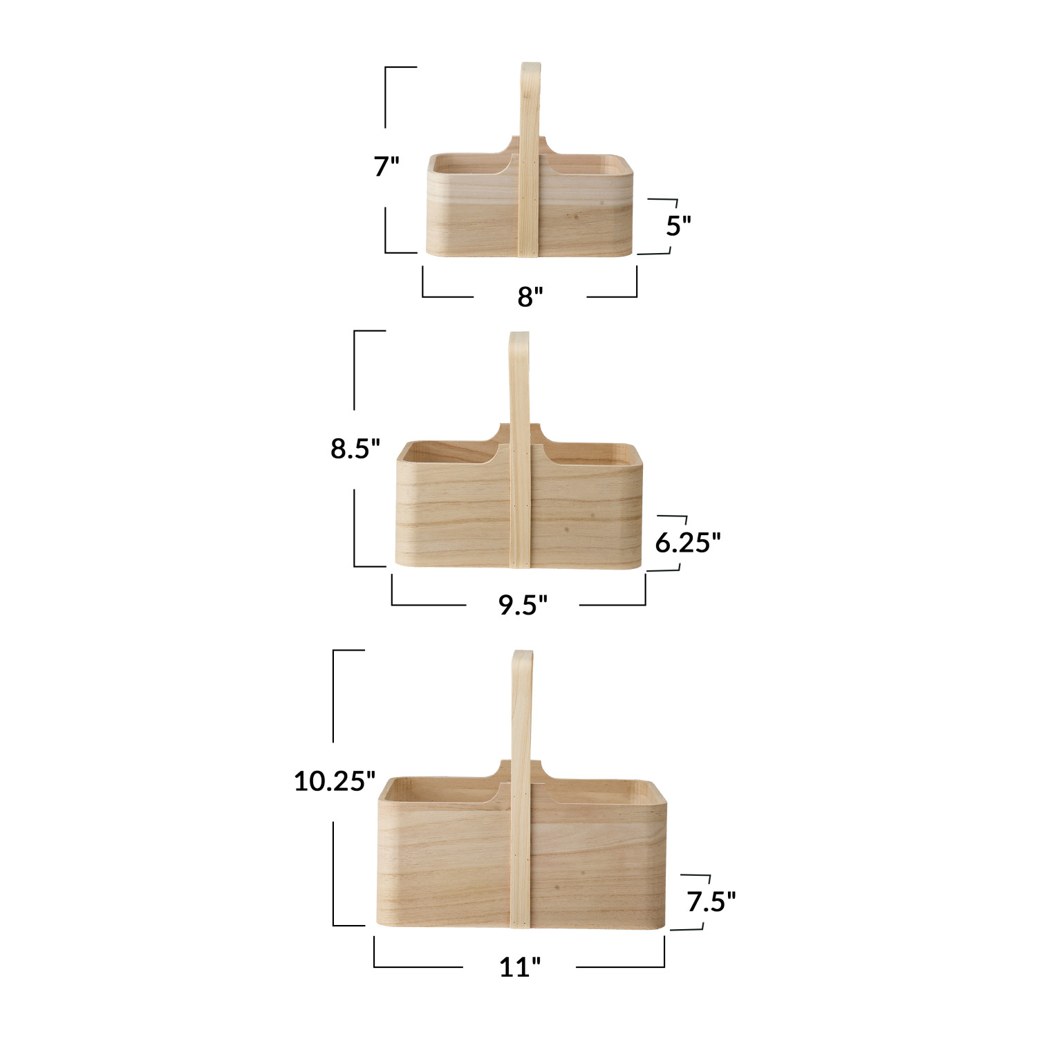 Catalog Name: 11"L x 7-1/2"W x 10-1/4"H, 9-1/2"L x 6-1/4"W x 8-1/2"H & 8"L x 5"W x 7"H Decorative Paulownia Wood Nesting Boxes w/ Handles, Natural, Set of 3