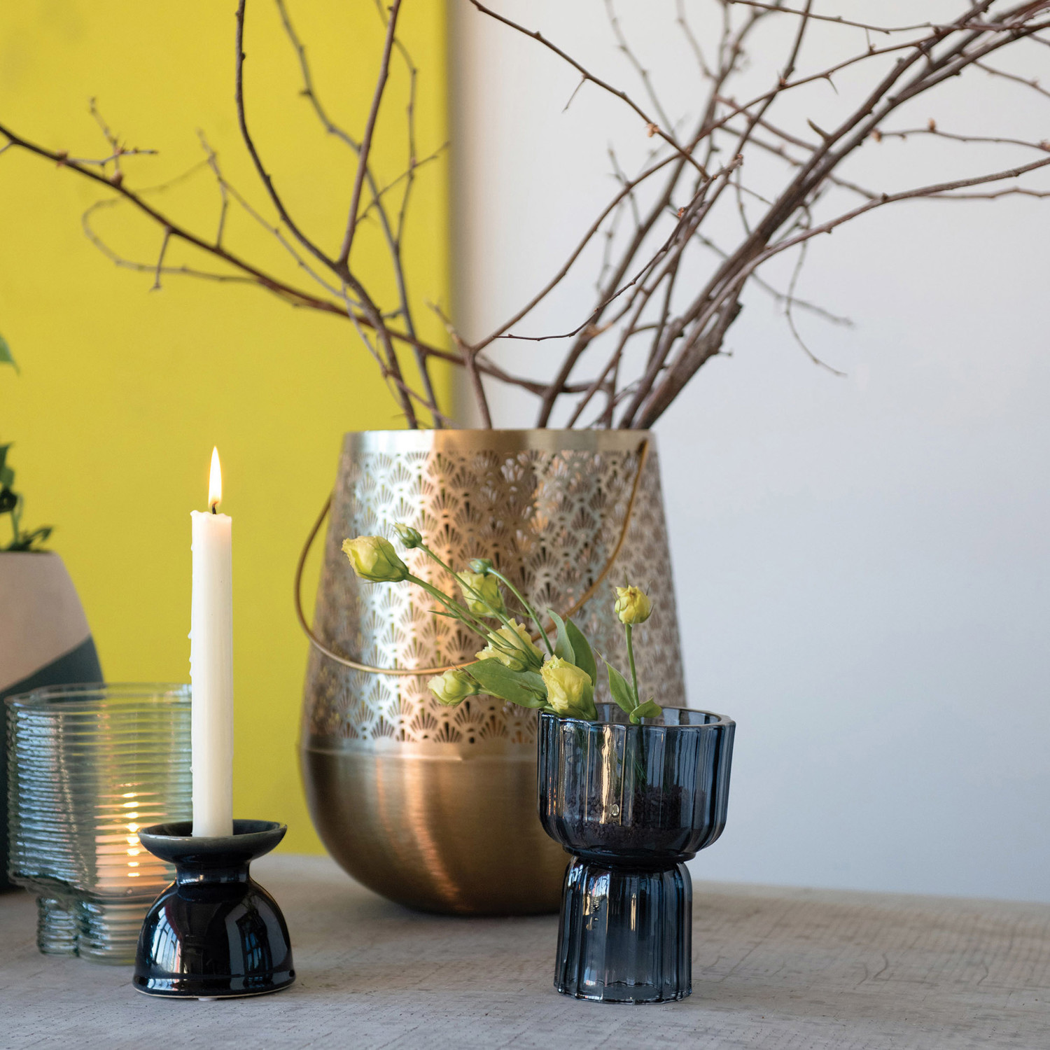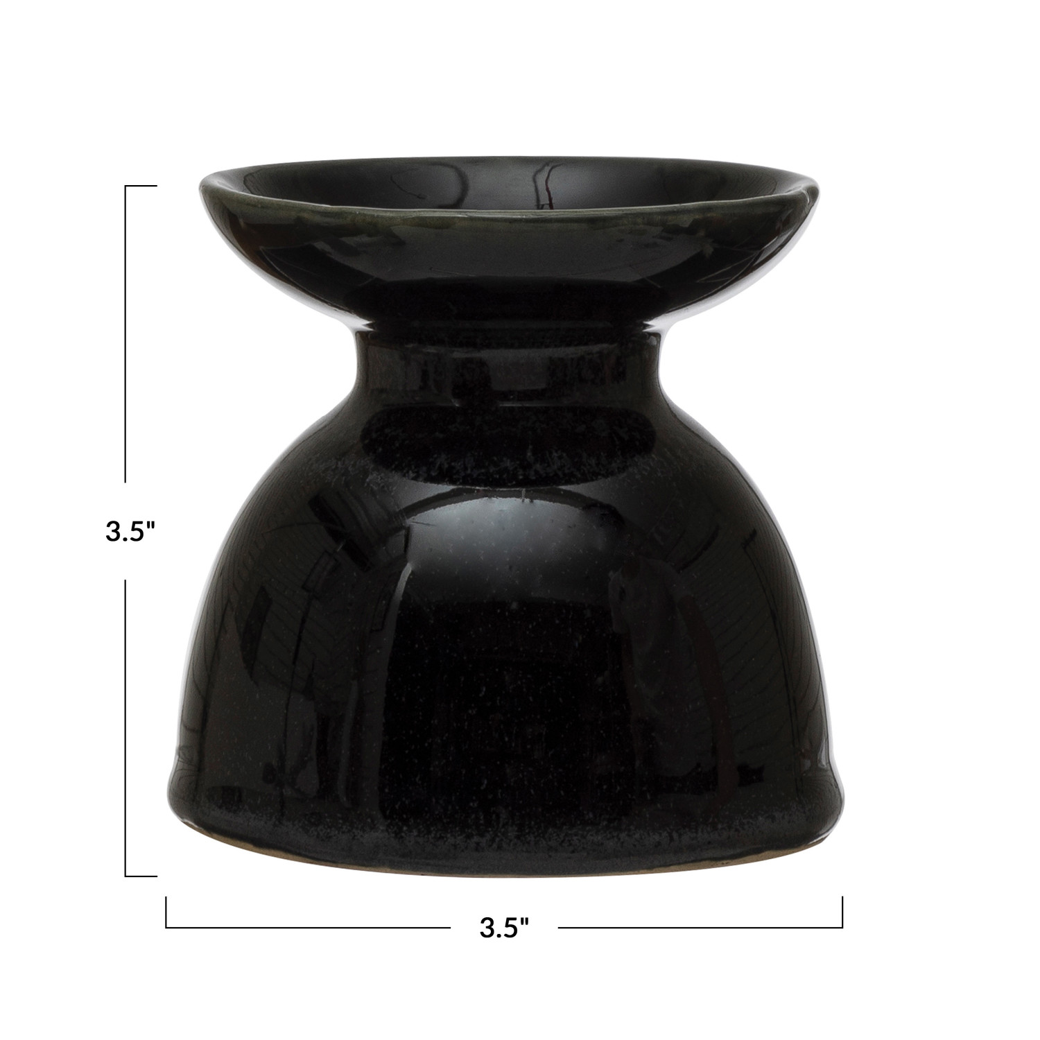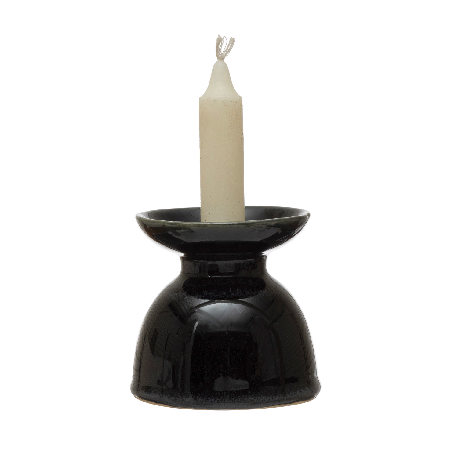 This bold and stylish stoneware pillar or taper candle holder with shiny black finish is an eclectic decor piece. It is a modish, contemporary accent that will be a unique piece in any room in the home or office. Holds standard wax or LED taper or 3" pillar candles. Each unique holder will vary.