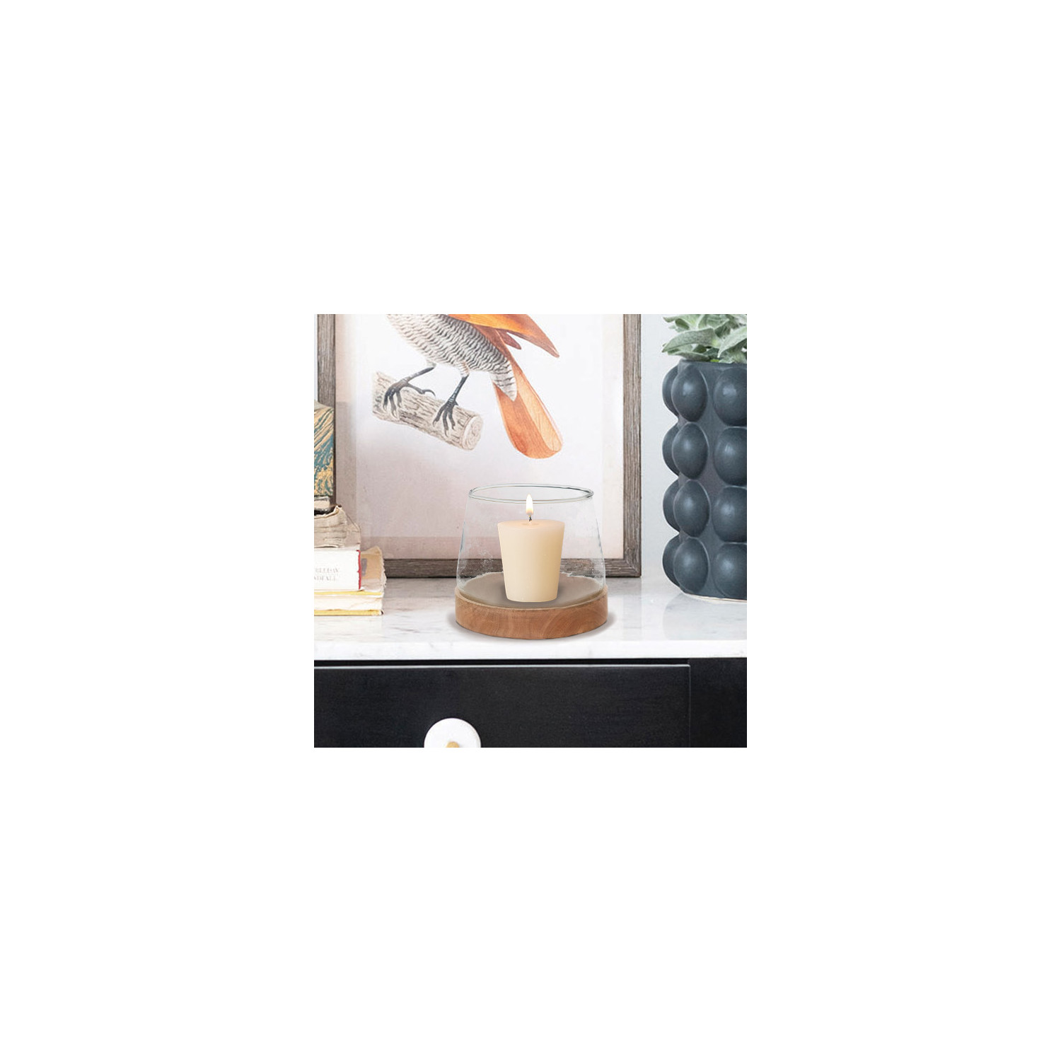A contemporary candle holder with a sleek glass bowl and a stylish mango wood base. Suitable for any home decor style, especially modern, rustic, or Scandinavian. Perfect for creating a cozy and elegant mood on a dining table, a mantelpiece, a console table, or a side table. Made of high-quality glass and mango wood.