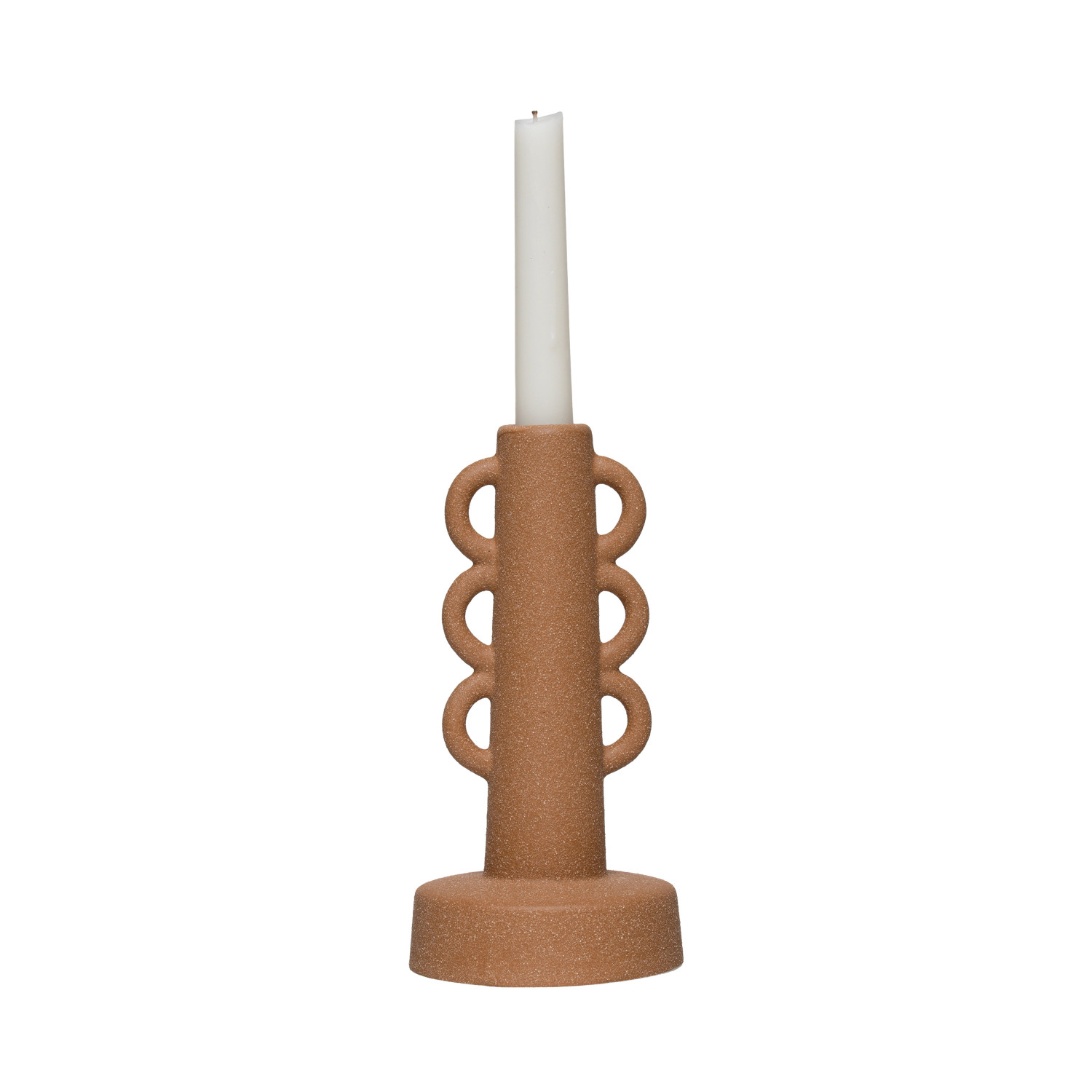 Catalog Name: 4" Round x 8-1/4"H Stoneware Taper Holder, Sand Finish, Terra-cotta Color