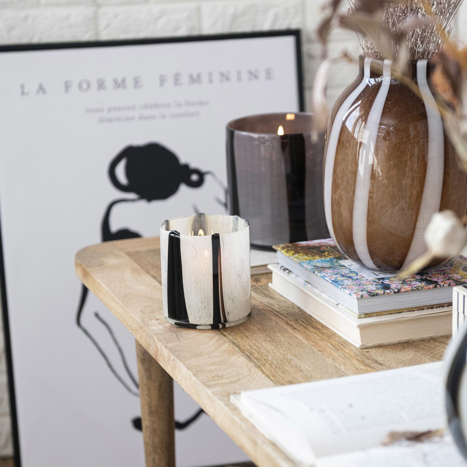 Catalog Name: 4" Round x 4"H Art Glass Striped Candle Holder/Vase, Cream Color & Black