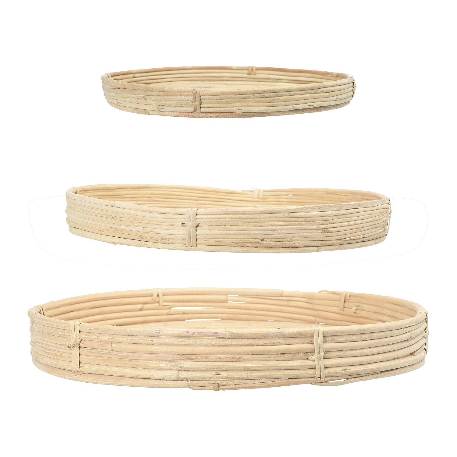 These hand-woven trays are made of 100% natural cane. The three sizes in this set can be used in a variety of ways. The trays can be used as display area on a coffee table, holding fresh fruits and vegetables in the kitchen, or as a serving piece for a special occasion.