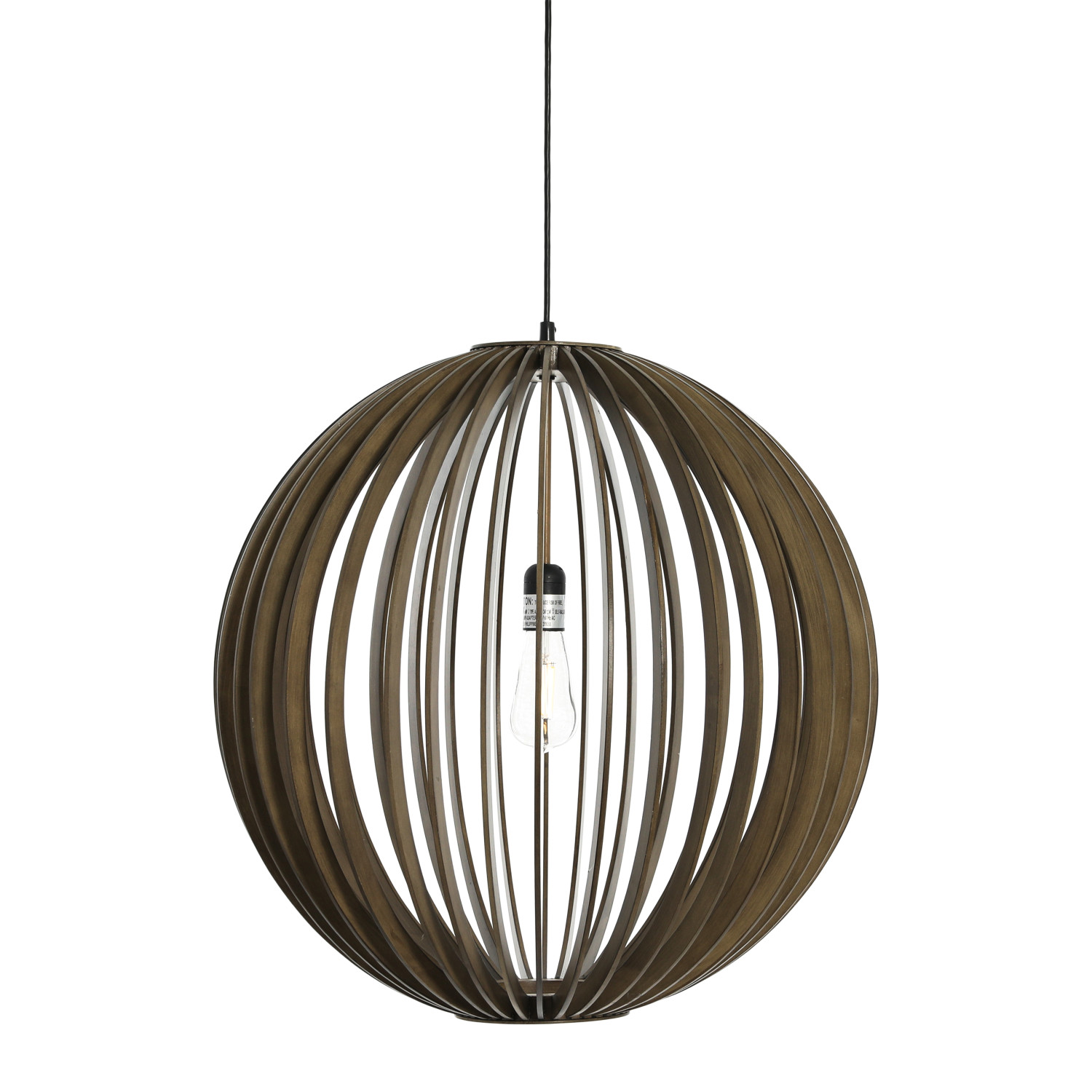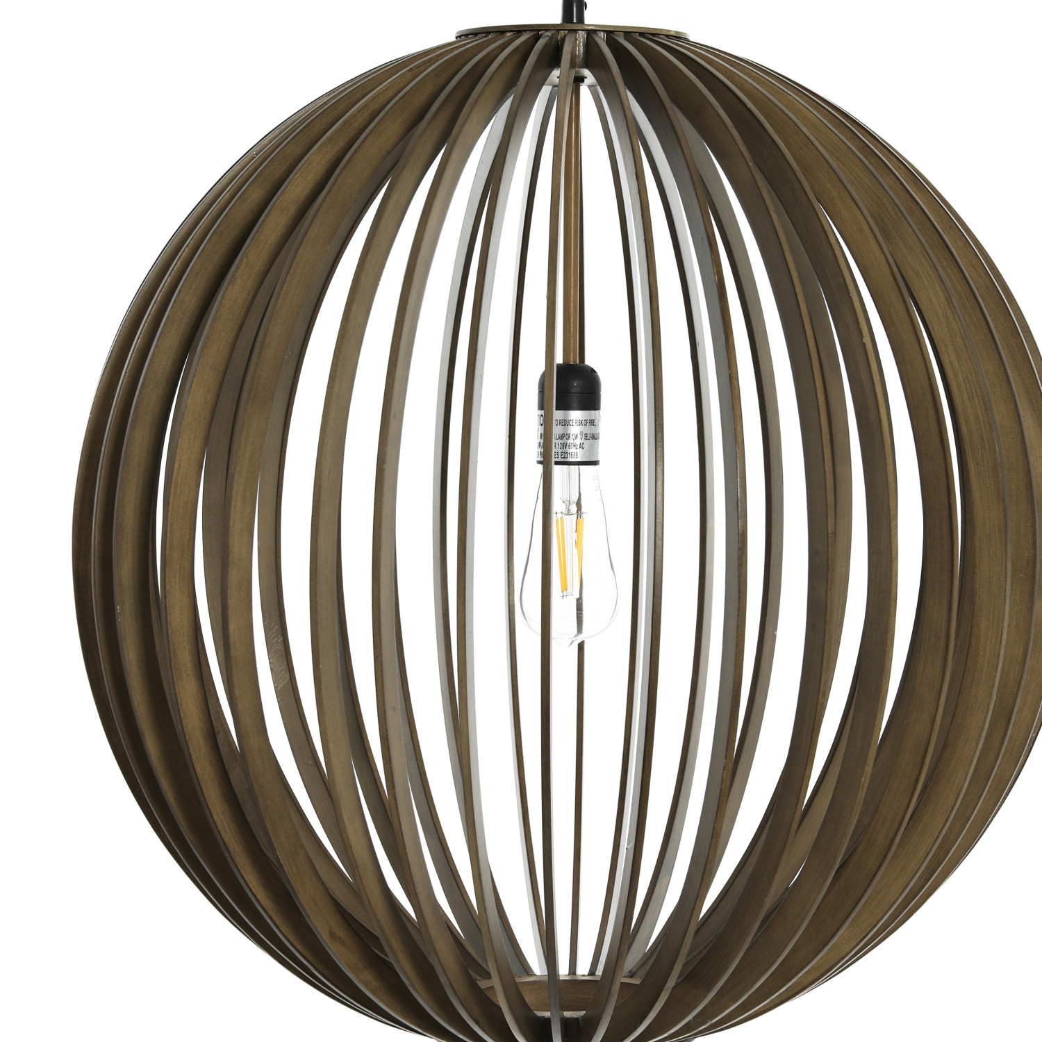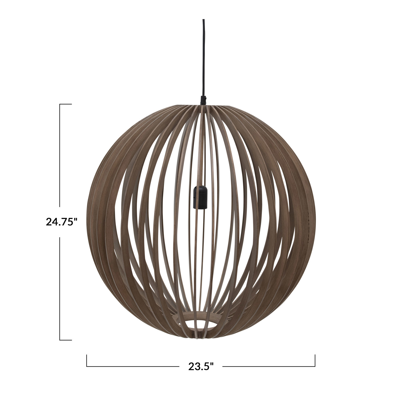 This modern ceiling light showcases a slatted wood globe hung from a sleek metal canopy. Hang as a bold accent piece in a room of any style from modern to farmhouse. Features a 4' cord. Hardwiring required. Maximum 60W bulb, not included. Wipe clean with dry cloth