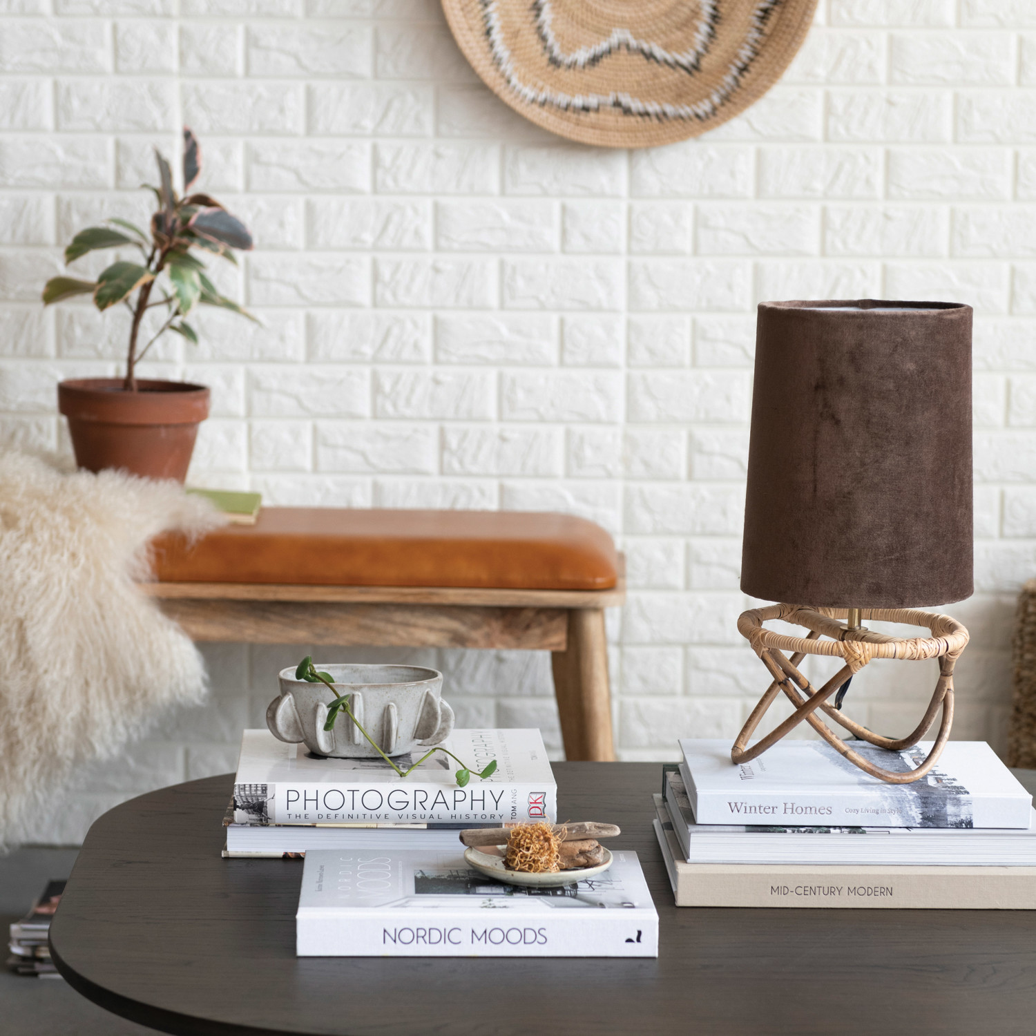 This strikingly modern table lamp showcases an intricately handwoven rattan base topped with a supple cotton velvet shade. Maximum 40W bulb not included.