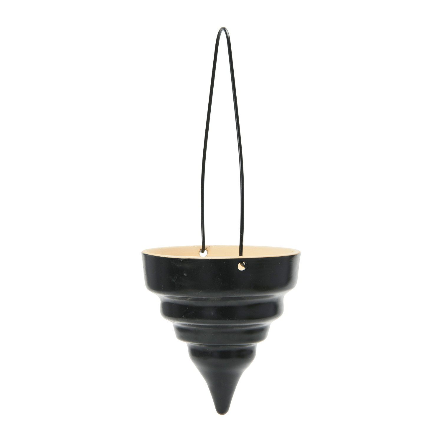 This fascinating 100% terra-cotta hanging planter, with matte black satin finish and black metal hanger, is an unusual and engaging find. It is an intriguing dimensional accent for a living room, bedroom, dining area, or kitchen and will jazz up a modern or contemporary setting. Hanging planters are a great way to add a touch of greenery and free up tabletop space.