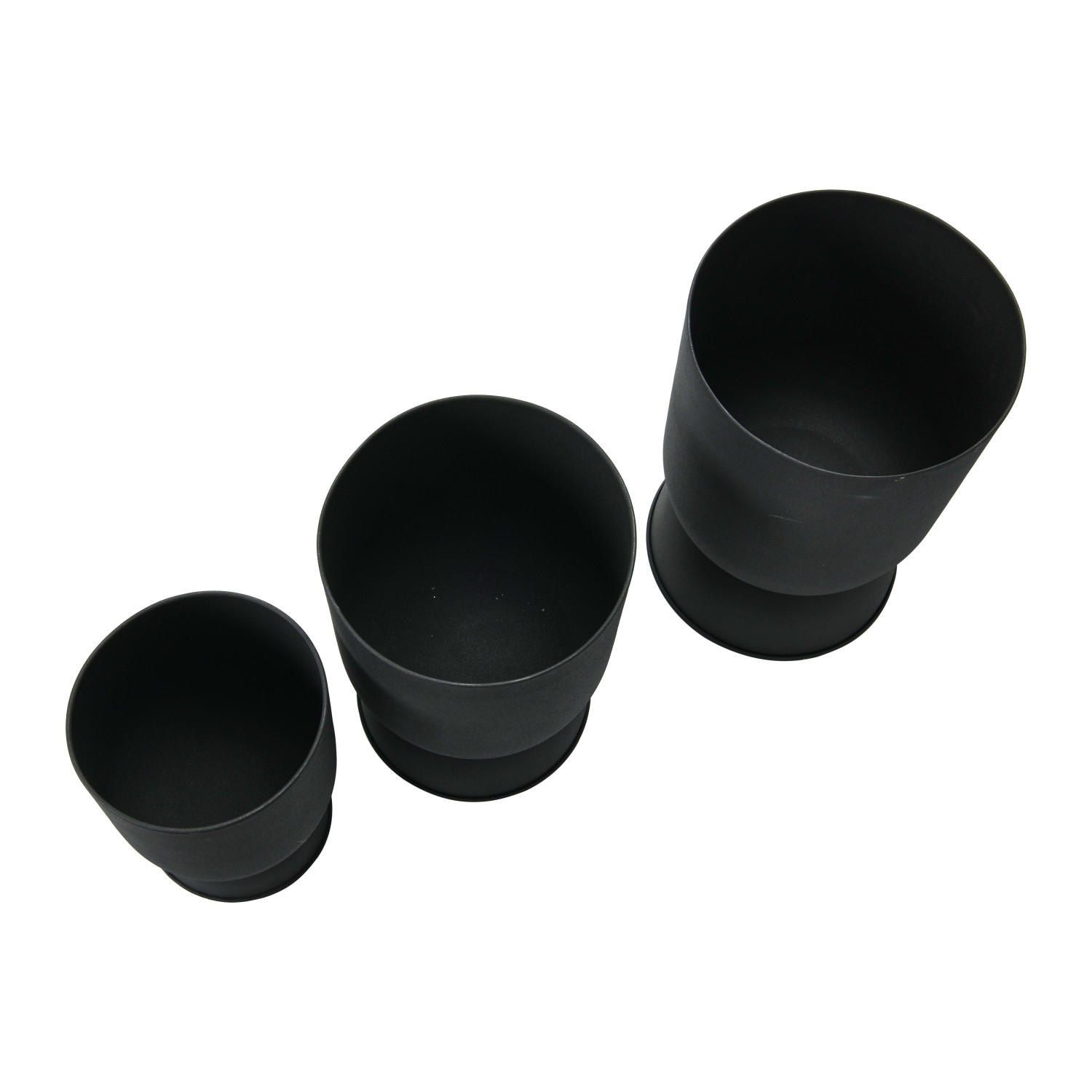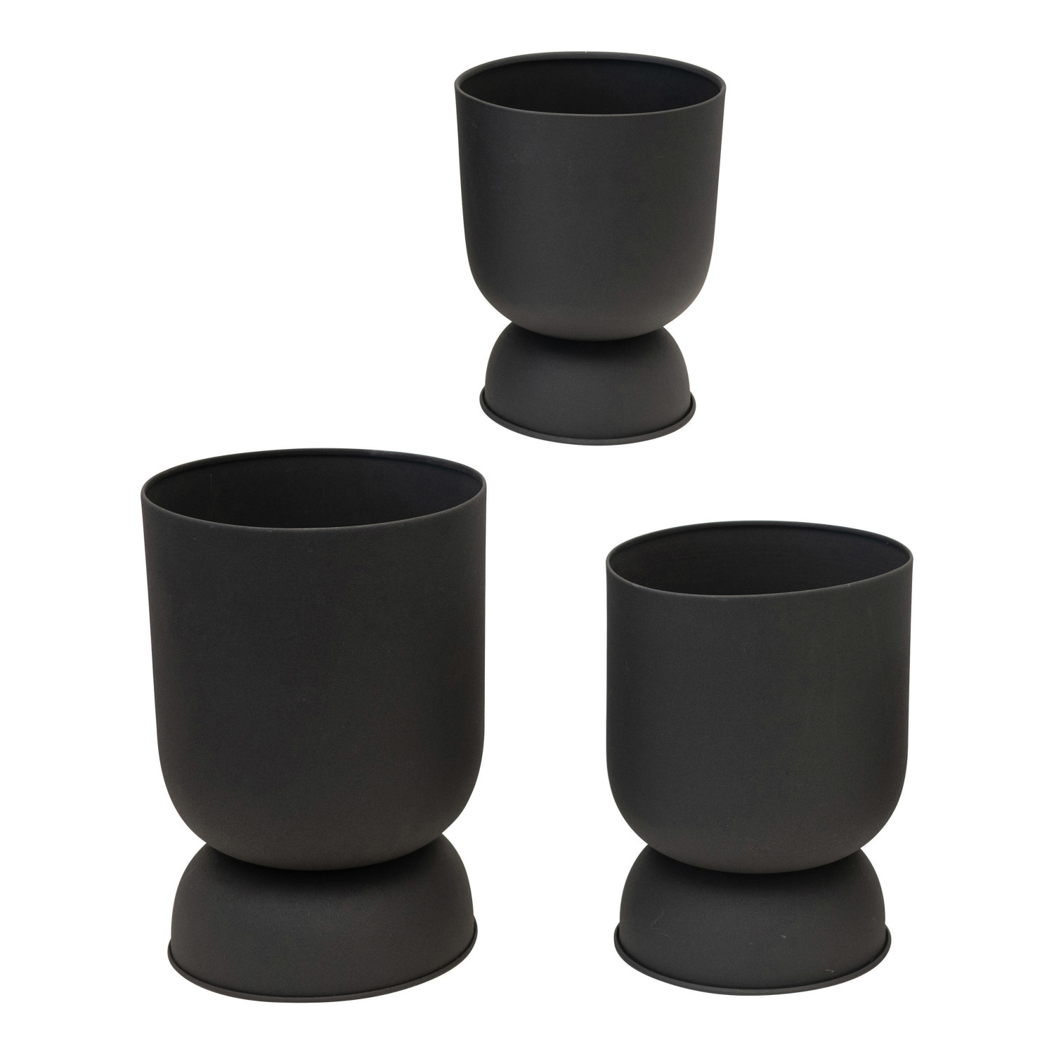 These handsome matte black, textured metal footed planters are a great addition to your store. They have a bold and stylish shape that makes this set a unique and attractive accent for any living room, kitchen, office, or sunroom. Comes in a matching set of three; holds 9", 8", and 7" pots.