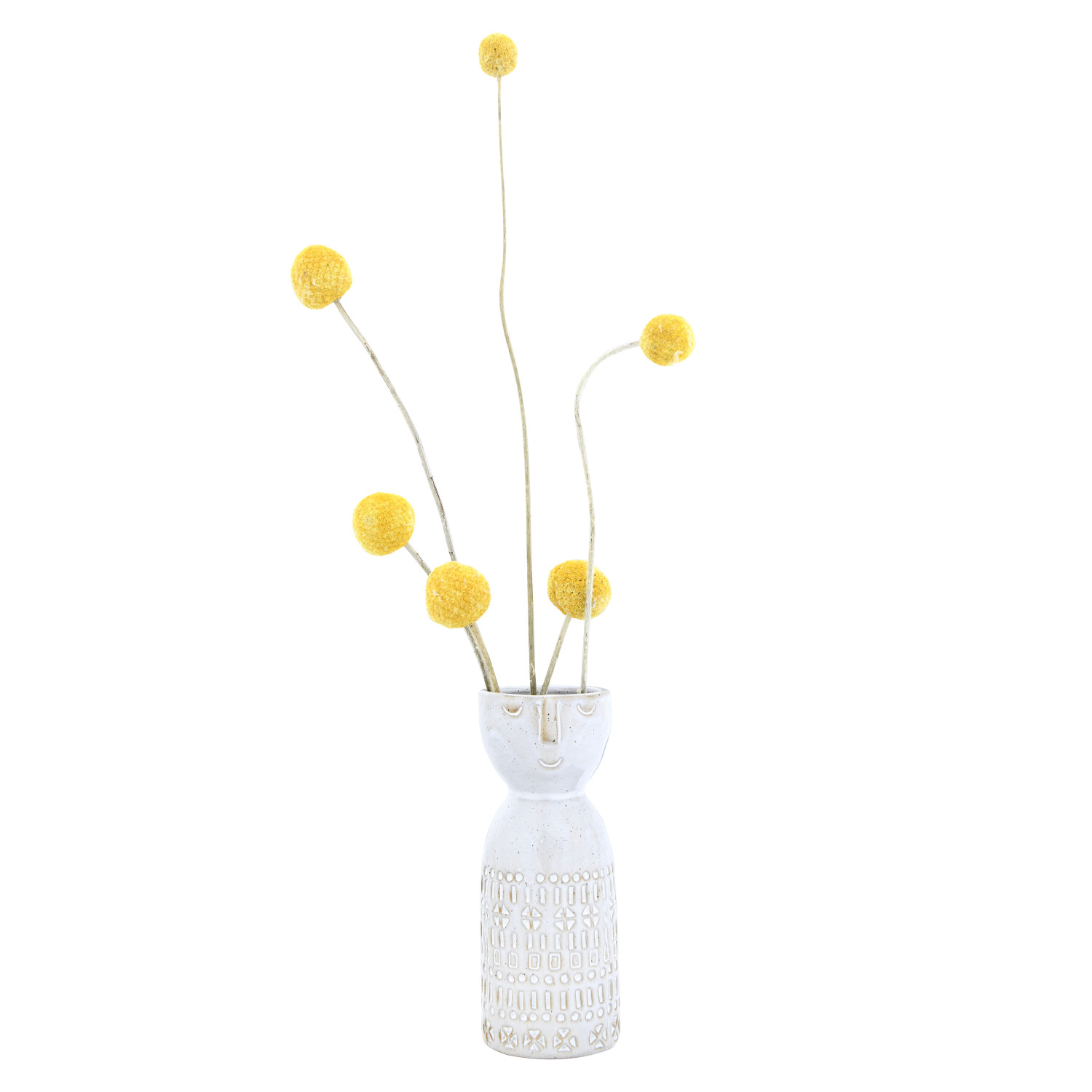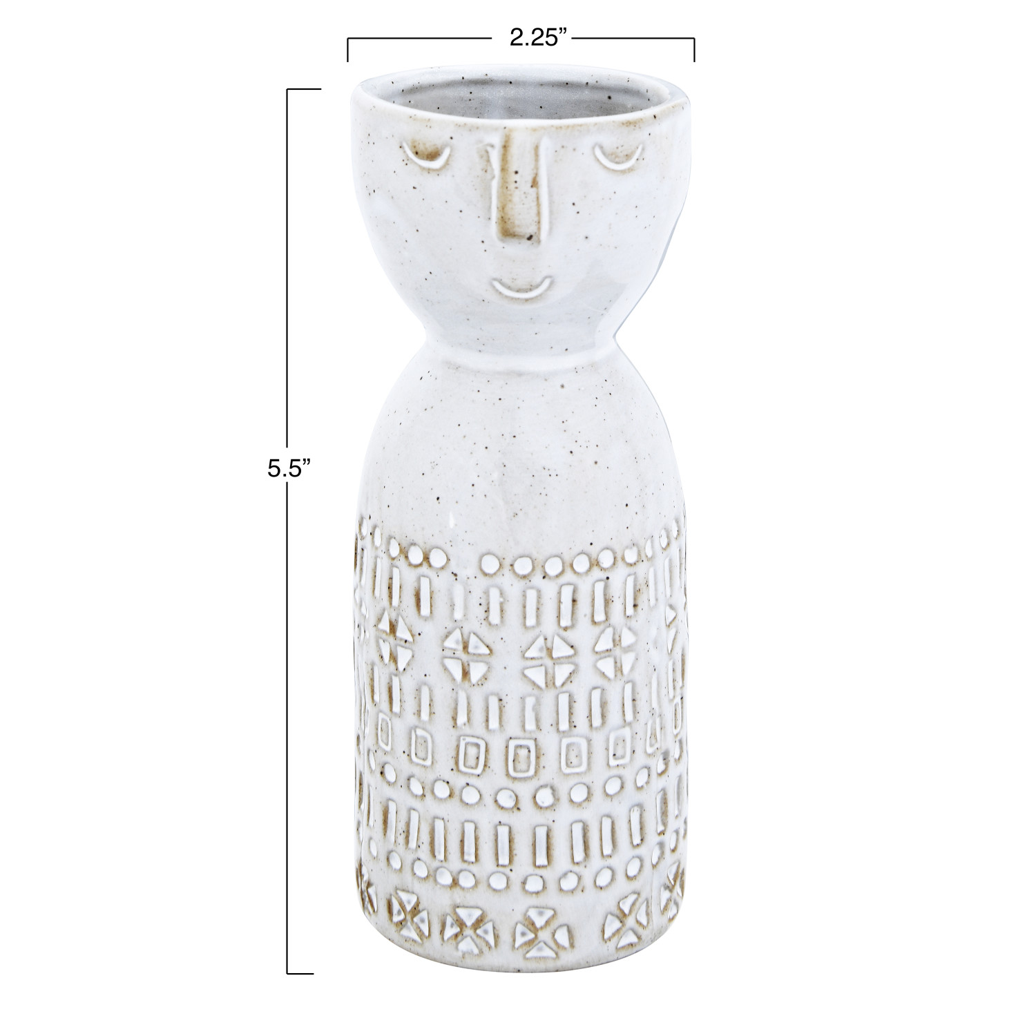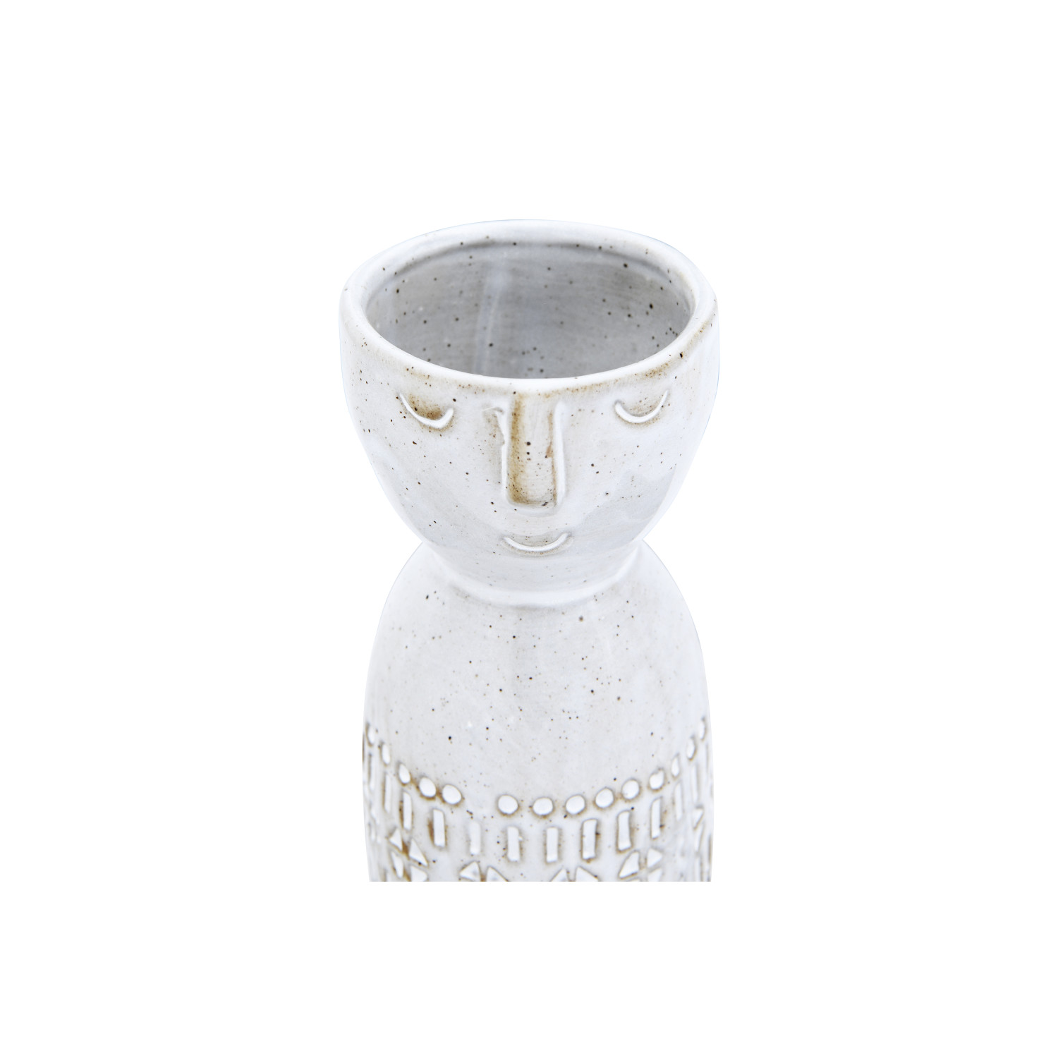 Varying embossed designs are paired with the shape of a face on the top of this stoneware vase. Alone, it is a perfect addition to a shelf or mantel. For a little extra color, fill with a few dried botanicals and display proudly on a tabletop or counter.