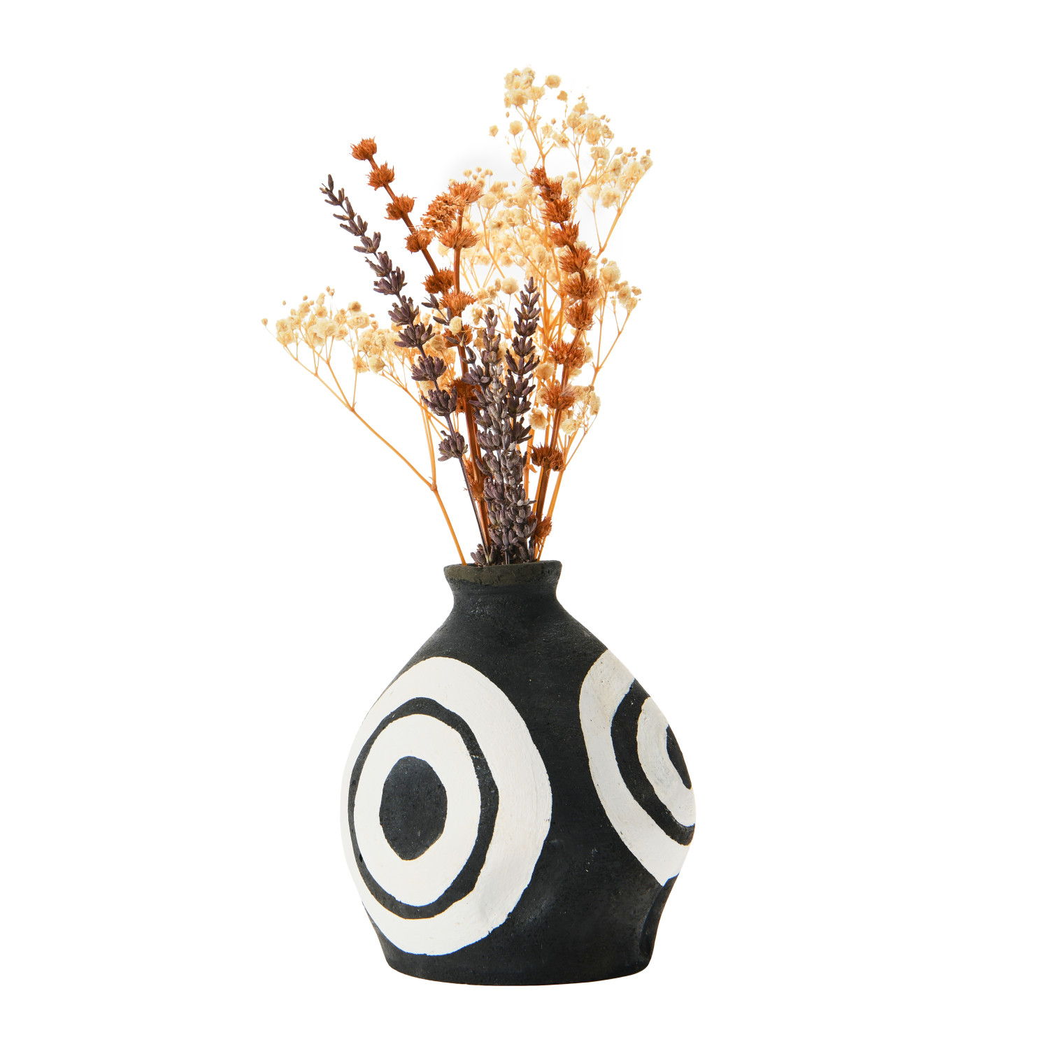 This unique and eclectic vase is the perfect partner to florals. Handmade, this terracotta vase features a sleek design with a black and white irregular circle pattern. Easily fill with dried pampas grass for a boho home, or fresh blooms for a bright decoration.