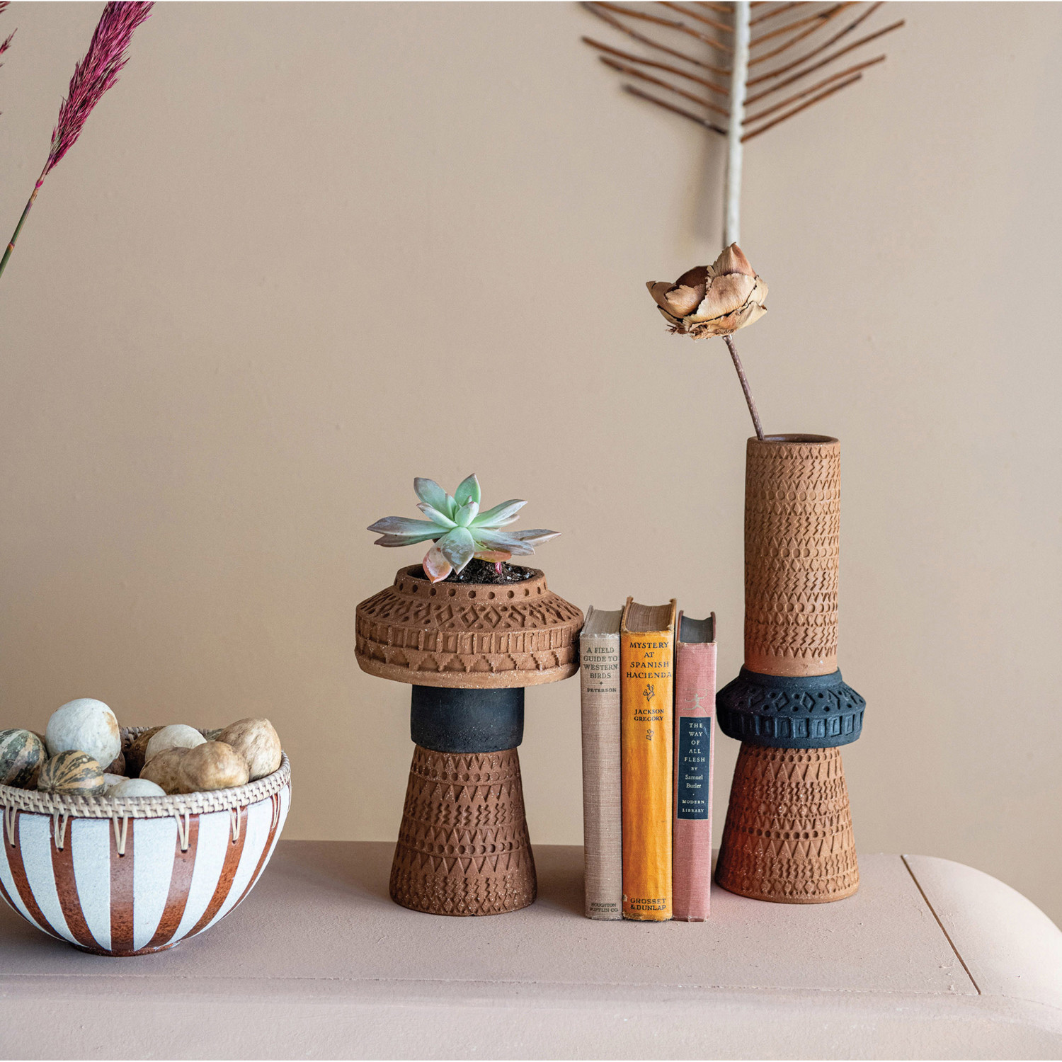 This simple and sleek vase is the perfect partner to florals. Handmade, this debossed terracotta vase features a simple black and terracotta colored pattern. Easily fill with dried pampas grass for a boho home, or fresh blooms for a bright decoration.