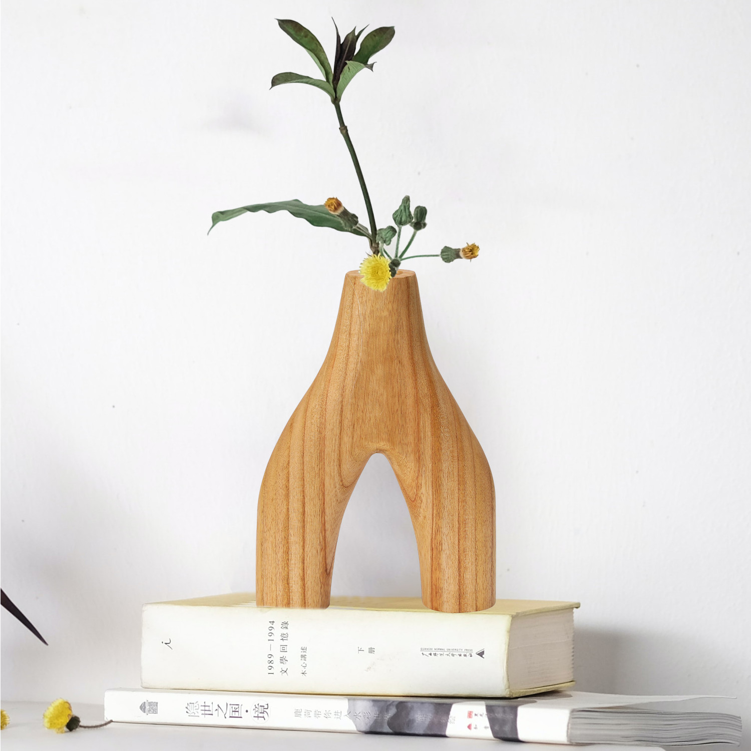 A rustic and charming vase with an arched shape and a natural wood color that showcases the grain and texture of the material. Features a hollow interior that can hold dried or artificial flowers, branches, or other decorative items.