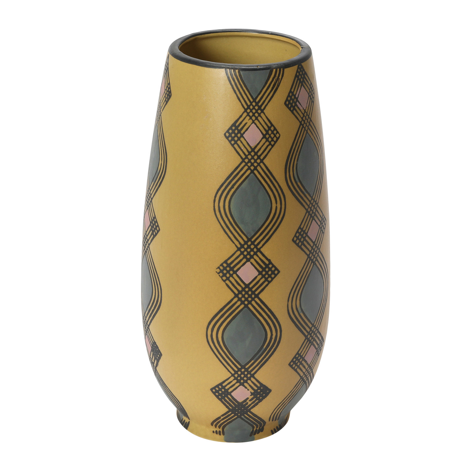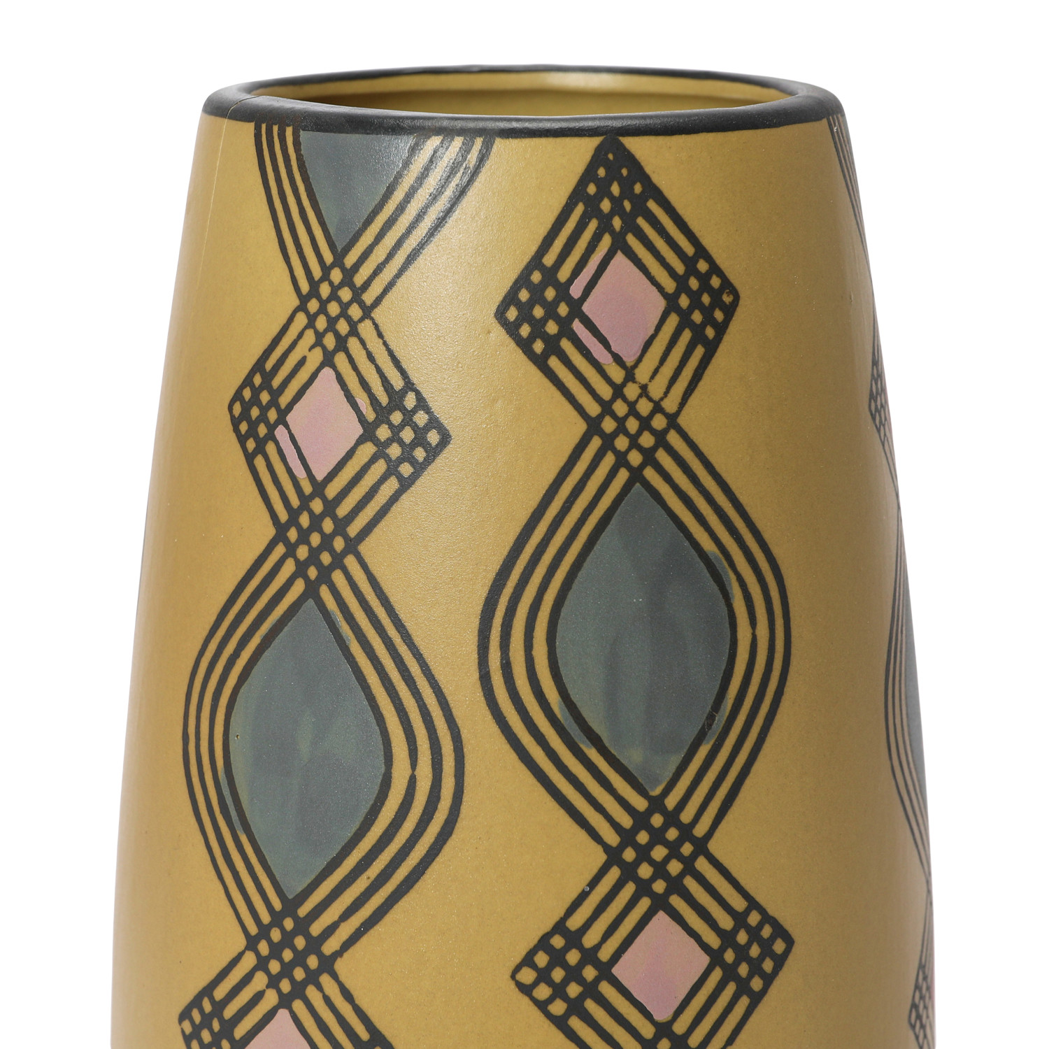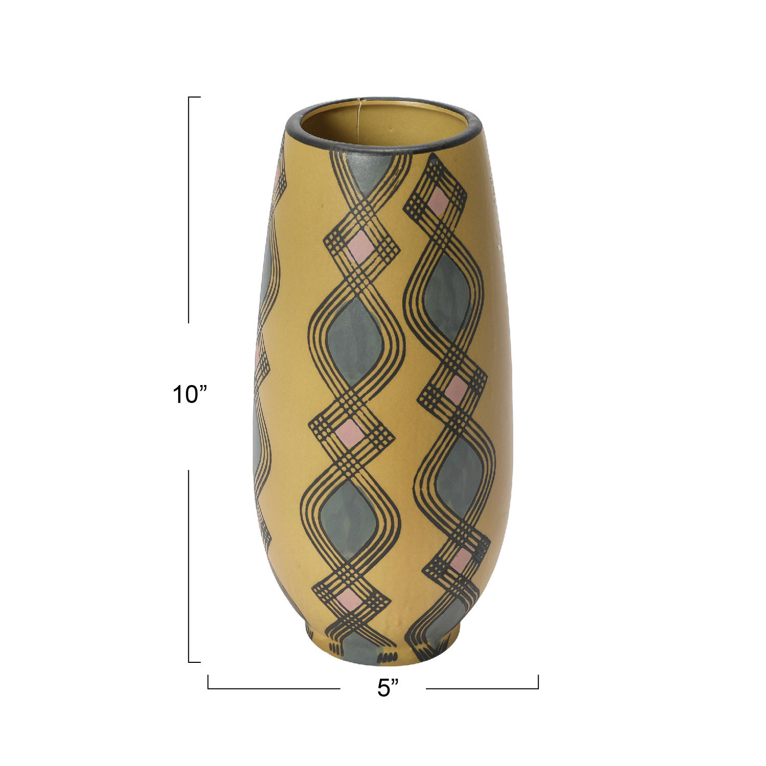 This bold stoneware vase showcases an intricately hand painted 2-tone geometric pattern.