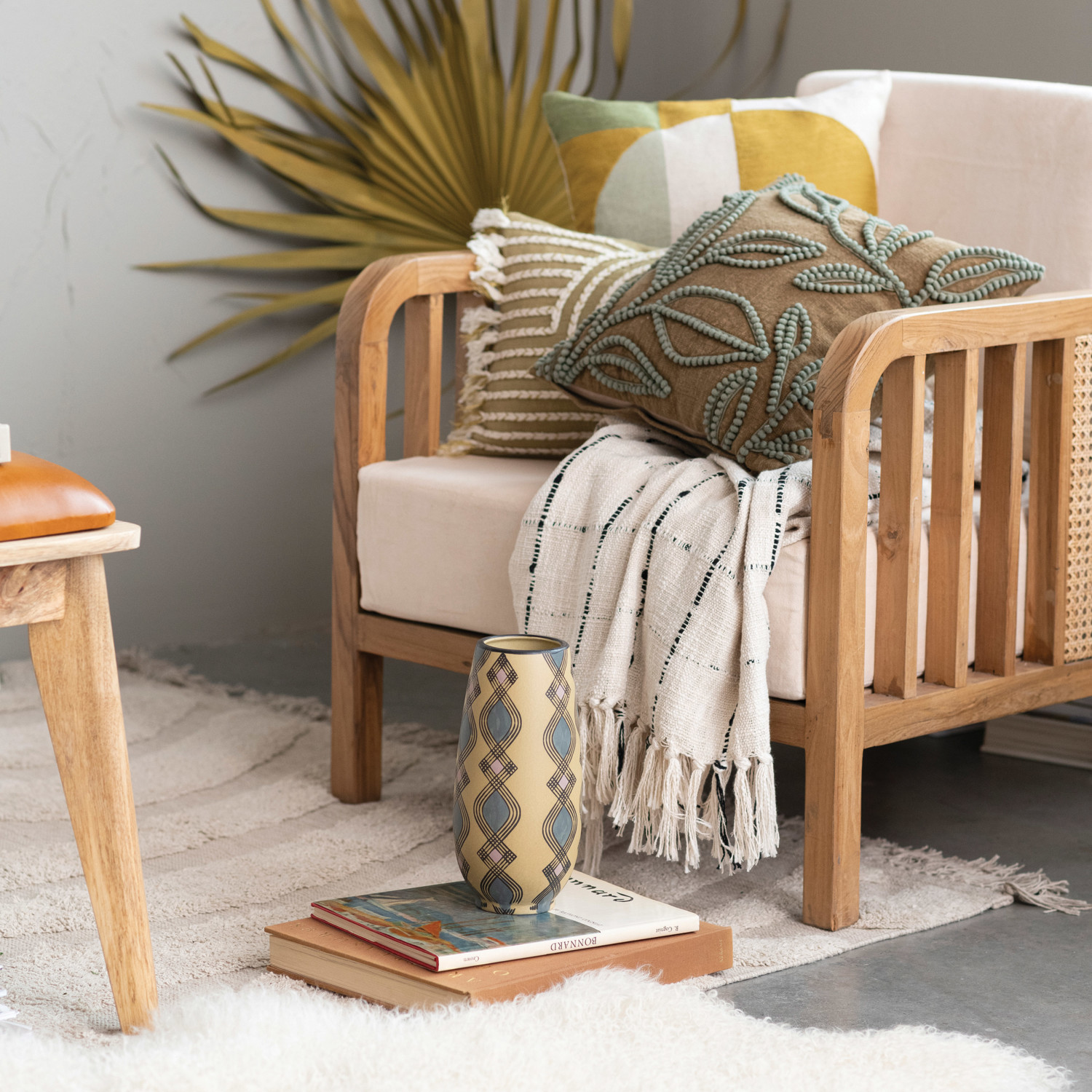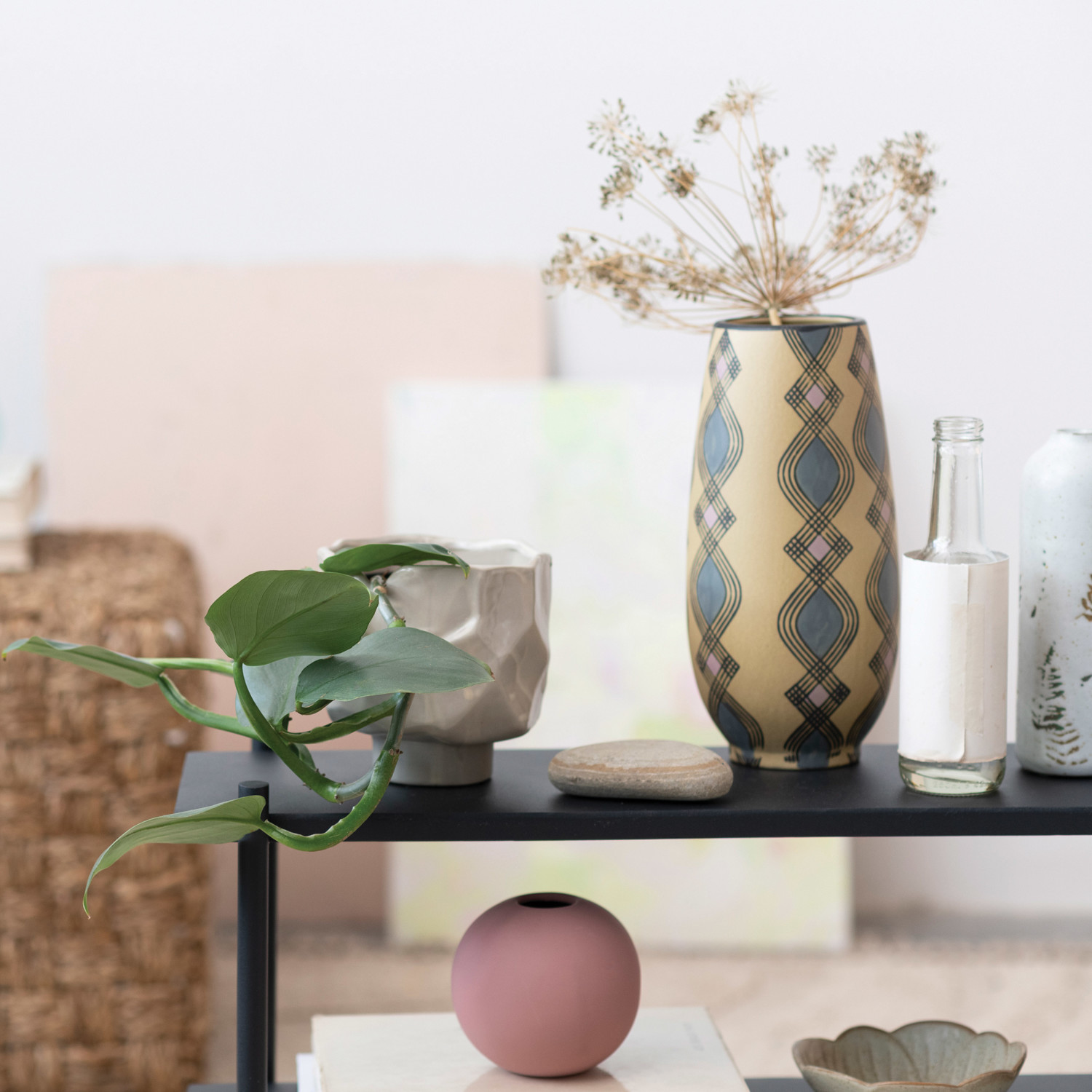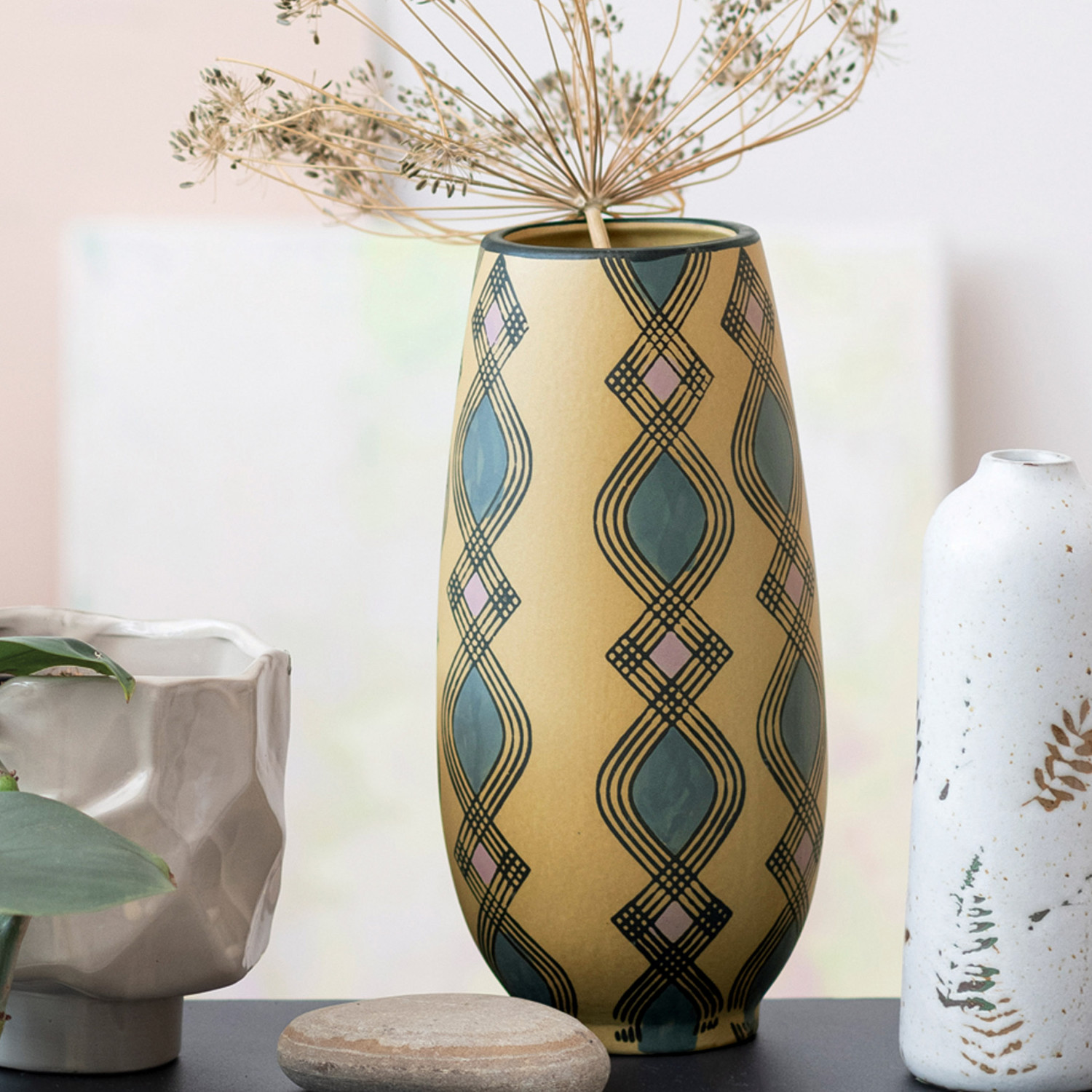 This bold stoneware vase showcases an intricately hand painted 2-tone geometric pattern.