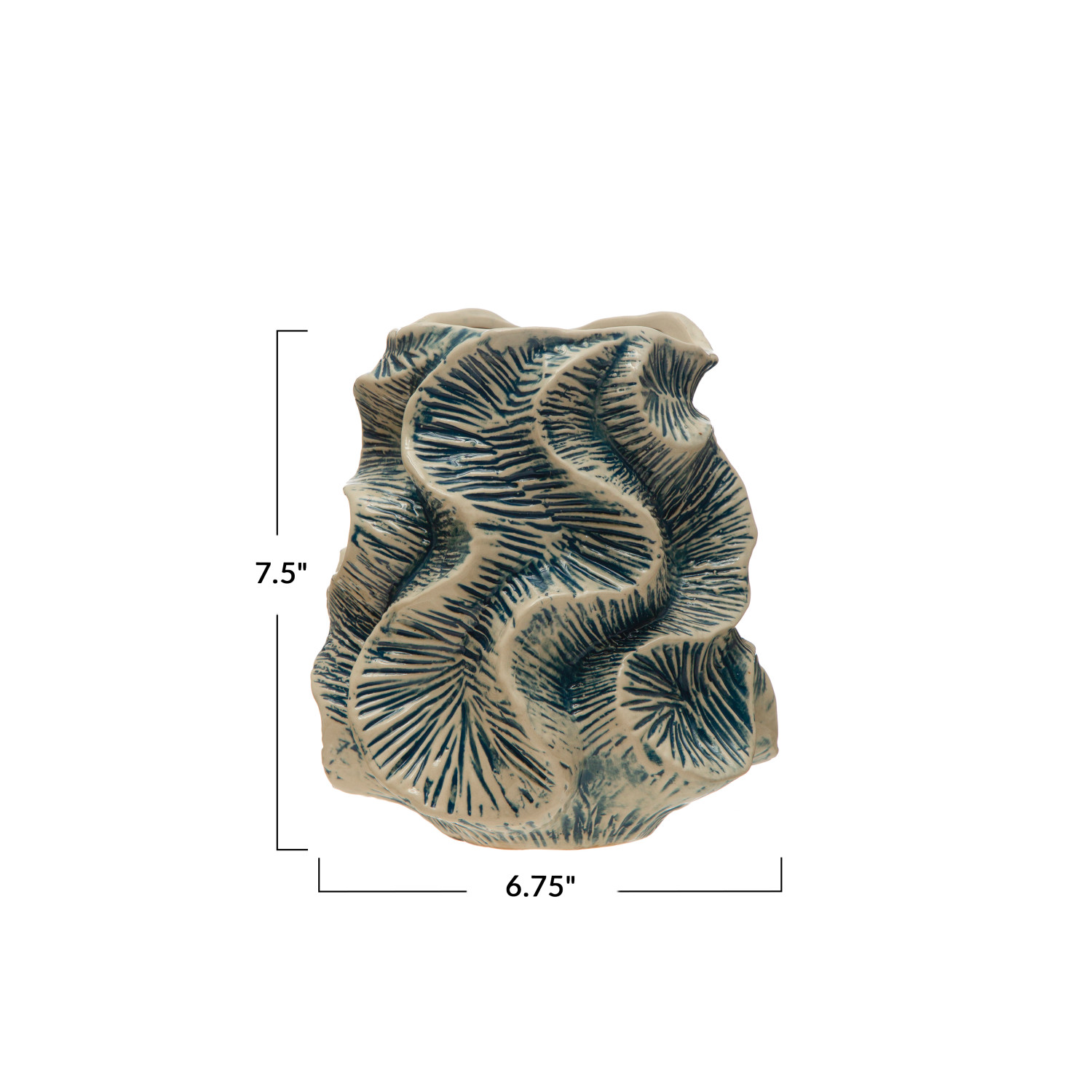 This blue and ivory stoneware vase with a wavy pattern is a stunning piece of décor that will enhance the look and feel of the home. The vase has a blue and ivory color scheme that is soothing and refreshing, creating a contrast with the wavy pattern. The wavy pattern creates a textured and dynamic effect on the surface, giving the vase a unique and attractive appearance. The vase has an organic shape that mimics the curves and contours of nature, creating a harmonious and elegant effect. The vase has a smooth and glossy surface that reflects light and adds some shine to the space. The vase is made of stoneware, a type of ceramic that is strong and long-lasting. The stoneware is also easy to clean, simply wipe it with a damp cloth or wash it with mild soap and water. The vase measures 6.75 inches in diameter and 7.5 inches in height, making it suitable for holding a variety of flowers, plants, or other decorative items. Whether place it on a table, a shelf, or a windowsill, this blue and ivory stoneware vase with wavy pattern will add some charm and beauty to the coastal, bohemian, or modern style home. A beautiful vase with a blue and ivory color scheme and a wavy pattern that creates a dynamic and eye-catching effect. This vase would be a great addition to any bohemian, coastal, or eclectic home décor. The vase is a perfect way to display a variety of flowers, plants, or other decorative items making it a versatile piece that can be used in any room of the home. Made of stoneware.