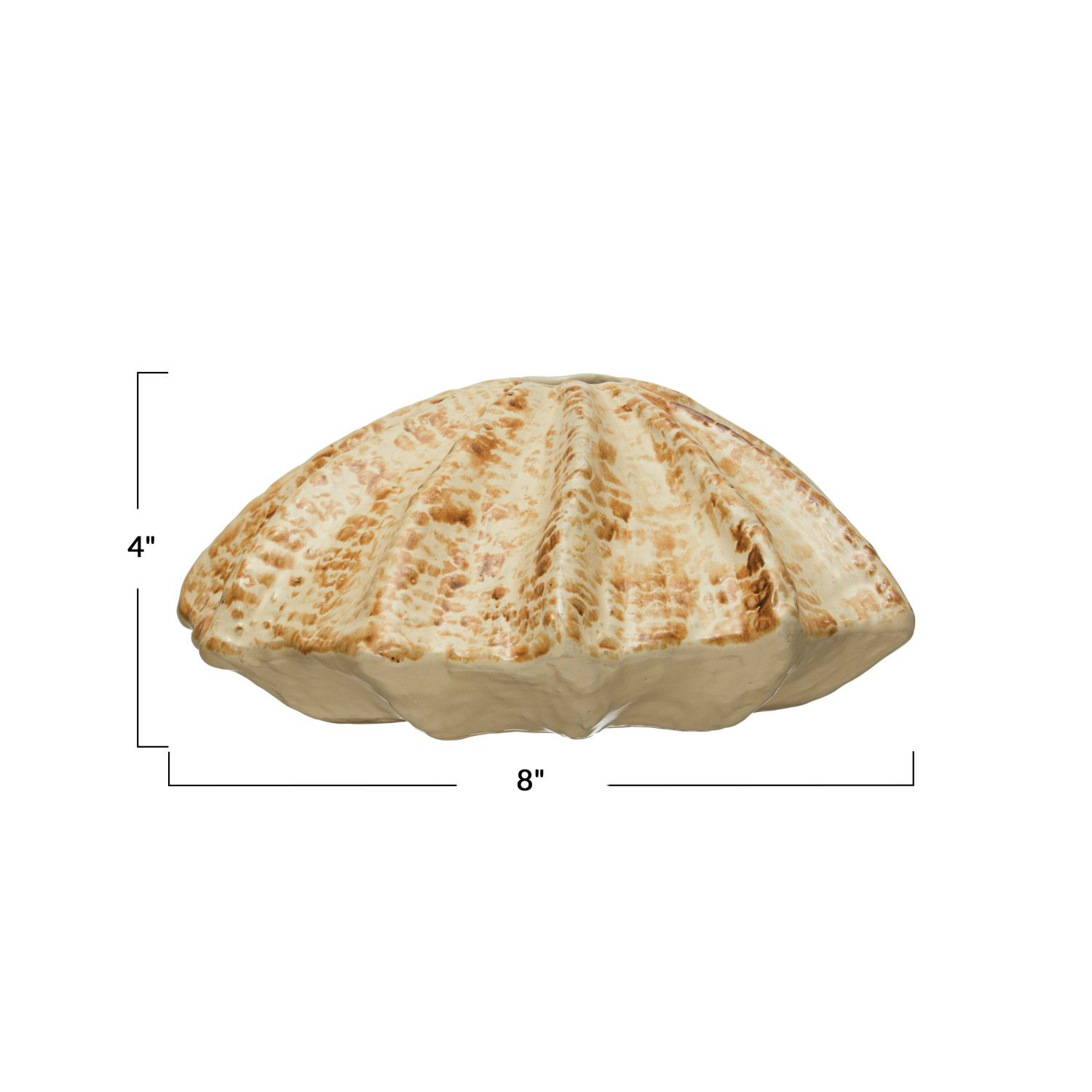 This shell-shaped stoneware vase with a reactive glaze in a warm tan hue is the perfect way to add a touch of oceanic flair to the home decor. The vase's unique shape and versatile size make it a perfect way to display a variety of flowers, plants, or other decorative items. The stoneware material is durable and long-lasting, and the reactive glaze gives the vase a unique, one-of-a-kind finish. The vase is also easy to care for, simply wipe it down with a damp cloth to keep it looking its best. The vase measures 8 inches in diameter and 4 inches tall, making it a perfect size for a coffee table, bookshelf, or mantle. This vase is the perfect way to add a touch of coastal style to any space. Whether looking for a unique centerpiece for the dining table or a stylish way to display shells, this vase is sure to impress. A stunning shell-shaped vase made of stoneware with a reactive glaze in a warm tan hue adds an oceanic vibe to the decor. This versatile vase would look great in a variety of home décor styles, from coastal to bohemian to mid-century modern. This decorative vase is versatile and can be used to hold a variety of flowers, plants, or other decorative items. Made of stoneware.