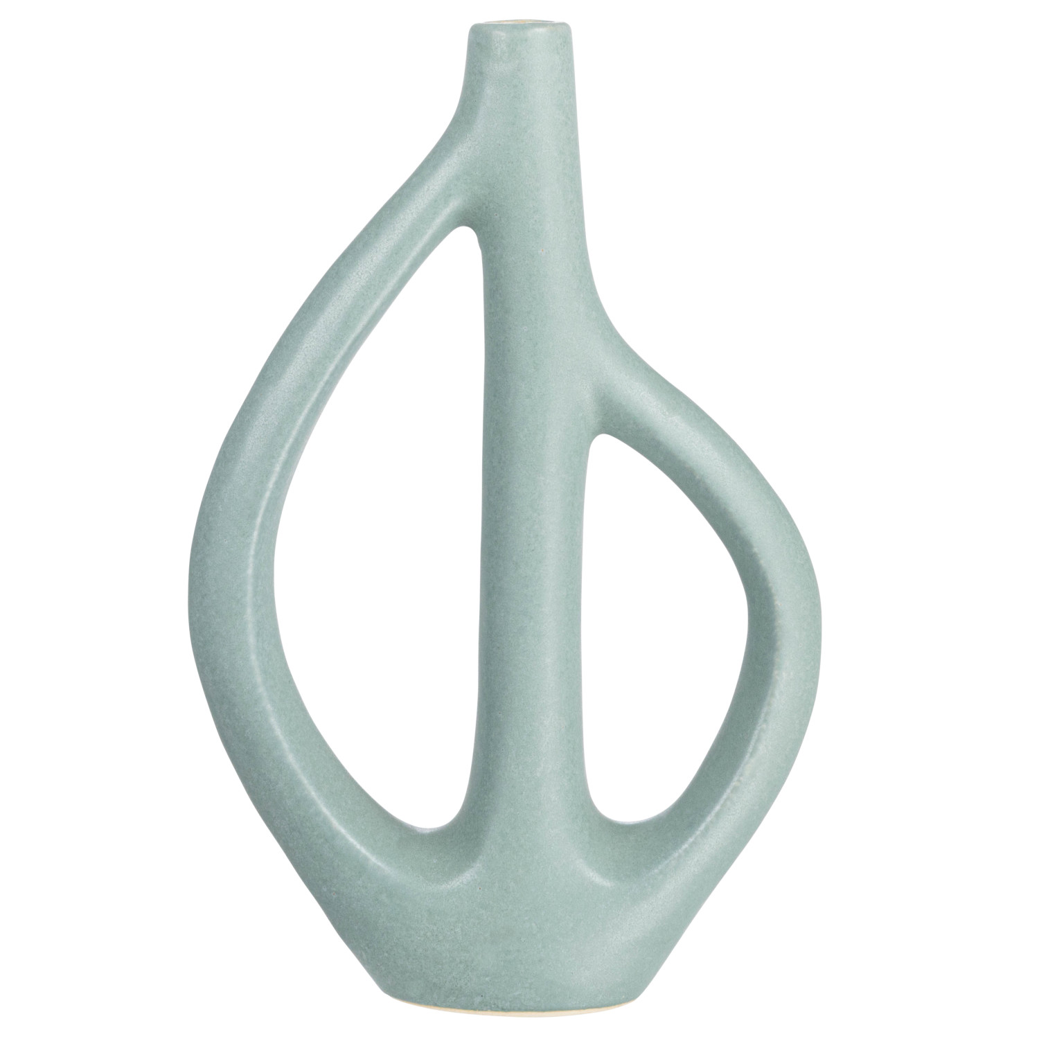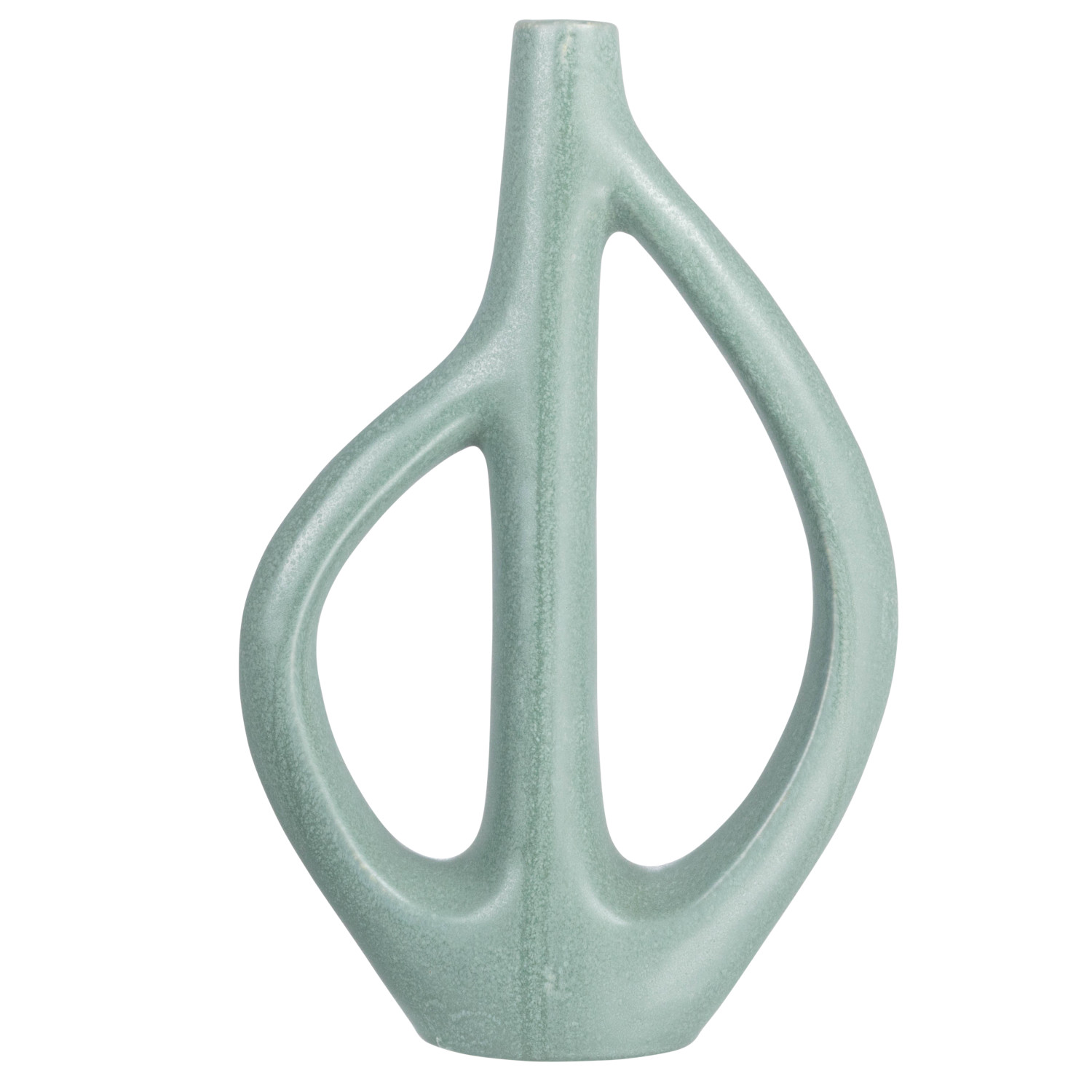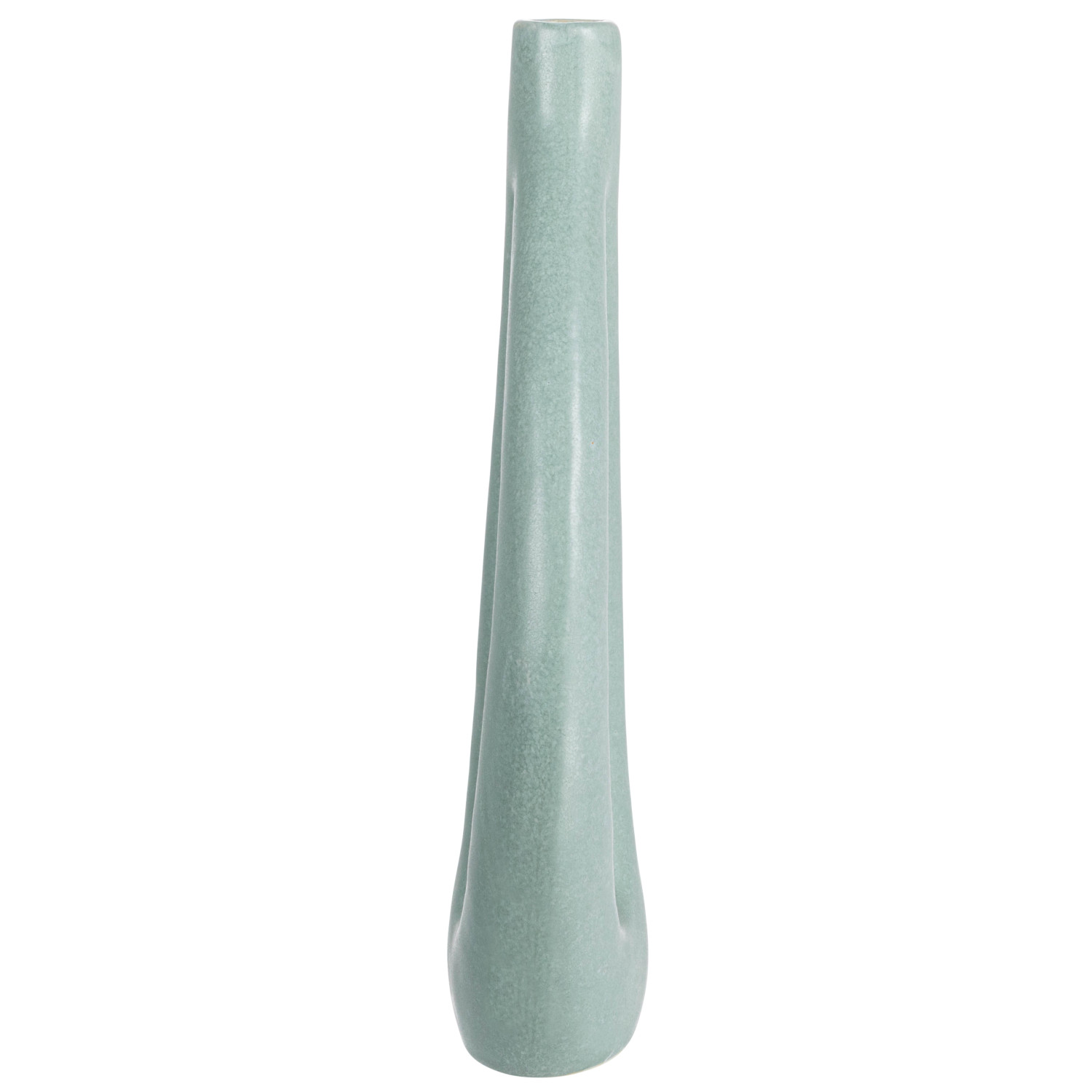 This green stoneware sculptural vase is a beautiful and unique addition to any home décor. The simple, cylindrical shape of the vase is both elegant and understated, making it a versatile addition to any home decor. The muted green color is both calming and sophisticated, and it would look great in a variety of styles, from traditional to modern. The teardrop handles add a touch of elegance and sophistication to the vase. They are made of the same green ceramic as the vase and are shaped like teardrops, which gives them a graceful and delicate appearance. The handles also make the vase easy to grip and move, which is helpful when filling or cleaning it. The vase measures 9.5 inches long, 3 inches wide, and 14.75 inches tall. This size makes it a perfect centerpiece for a dining table or coffee table. It would also look great on a shelf or mantle. This green stoneware sculptural vase is versatile, elegant, and functional, making it a perfect choice for any home. A stunning green vase with a simple, cylindrical shape and teardrop handles, made of durable stoneware that shines in simple spaces. This versatile vase would look great in a variety of home décor styles, from traditional to modern. Use it to hold dried flowers or twigs that match the season, or just leave it empty as a beautiful accent piece. Made of stoneware.