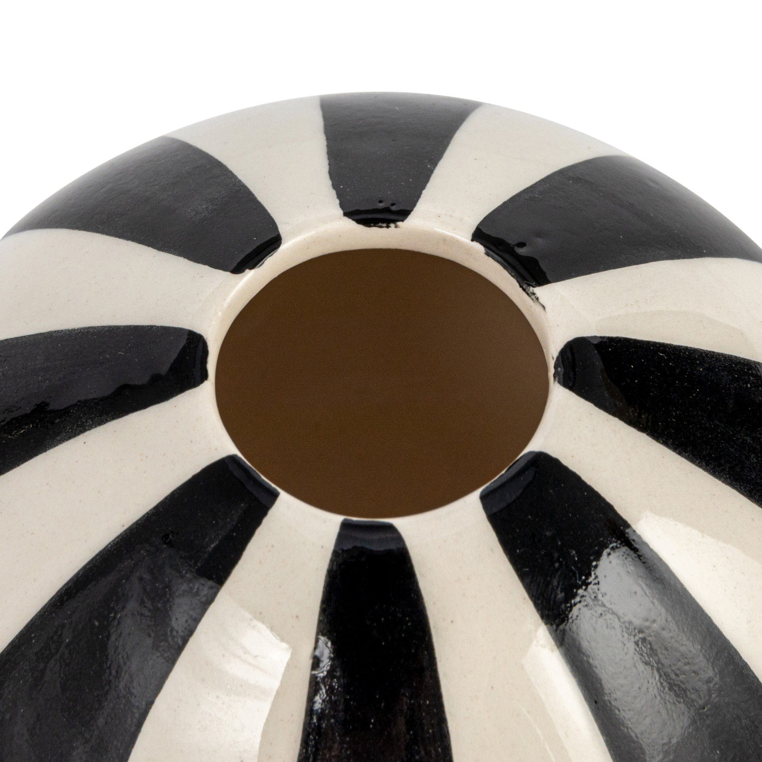This charming round stoneware vase is adorned with captivating black and white stripes, making it a perfect fit for modern, minimalist, or eclectic interiors. The vase's contemporary design and monochromatic color scheme effortlessly add a stylish and artistic touch to any space. The vase has a sturdy 1-inch round opening that ensures stability and durability, enjoying its beauty for years to come. Whether displayed as a standalone accent or grouped with other decorative items, this vase is sure to turn heads. The vase measures 4.13 inches in diameter and 3.88 inches tall. It is made of stoneware and is easy to clean. It is a unique and versatile piece of décor that is sure to add a touch of beauty to any space. This vase has a round ball shape adorned with captivating black and white stripes. With its contemporary design and monochromatic color scheme that makes it a perfect fit for modern, minimalist, or eclectic interiors. Whether displayed as a standalone accent or grouped with other decorative items, it has a 1-inch round opening that can be displayed as a standalone accent or grouped with other decorative items. Made of stoneware.