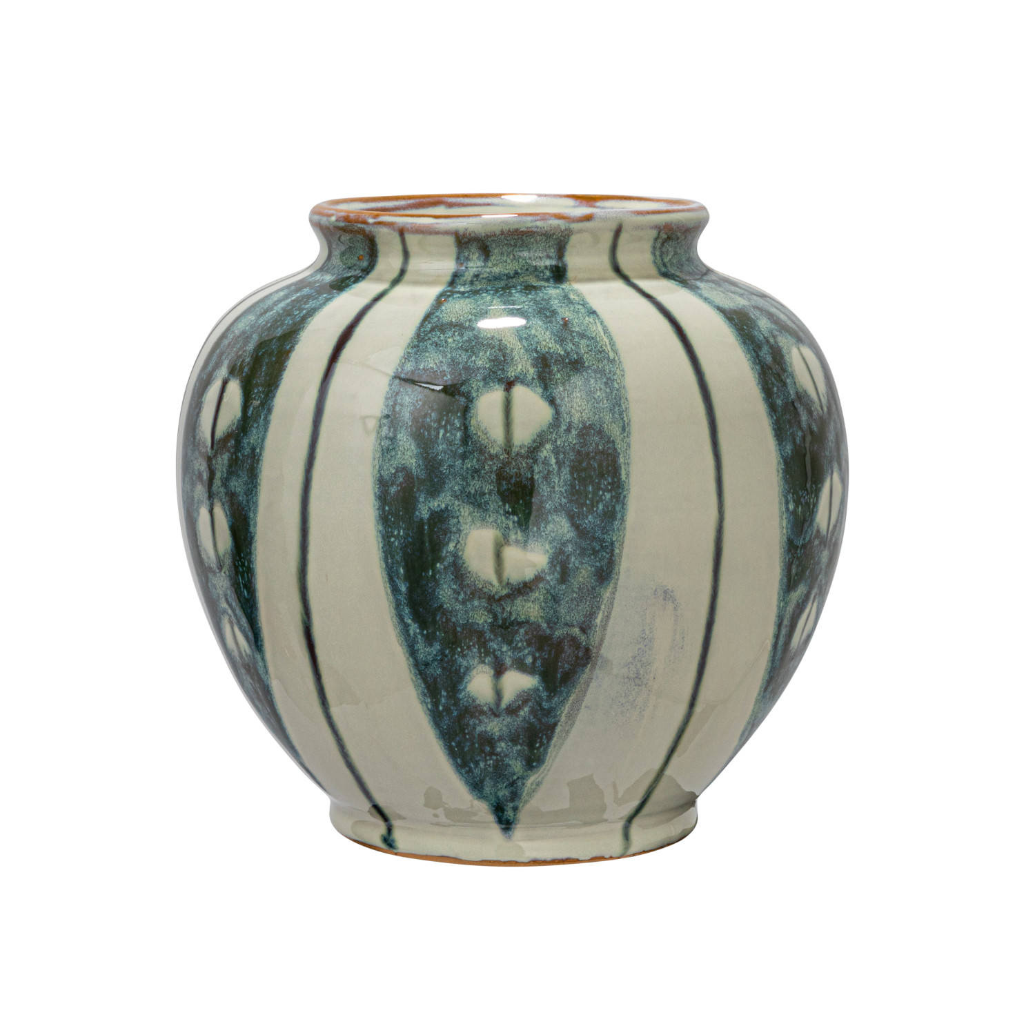 Add some style and personality to any home or office with these stunning vases. These vases come in various shapes, sizes, materials, and designs, offering a wide range of options to suit any preference and decor. Whether looking for a simple and elegant ceramic vase, a colorful and whimsical glass vase, a rustic and natural wood vase, or a modern and sleek metal vase, there is something for everyone in this collection. These vases are perfect for displaying flowers, plants, candles, or other decorative items, or simply as standalone accents that will enhance the beauty and charm of any space. Crafted from high-quality stoneware and meticulously hand painted with care, resulting in a unique piece where variations and brushstrokes add to its charm, this stunning 9-inch round x 8.5 inches vase showcases a beautiful combination of a cream color and green stripes that create a captivating visual display. With its hand-painted design and earthy color palette that makes it a versatile piece that effortlessly complements various interior themes, this 9-inch round hand-painted stoneware vase with stripes is a perfect addition to homes with rustic, farmhouse, or eclectic decor styles and adds a touch of artisanal beauty and natural elegance to any room whether placed on a sideboard, accent table, or used as a centerpiece. With a sturdy stoneware construction that ensures durability and a reactive glaze finish that adds depth and character, this vase has a 4.25-inch round opening that provides ample space to display medium to large floral arrangements or botanicals. Made of stoneware.