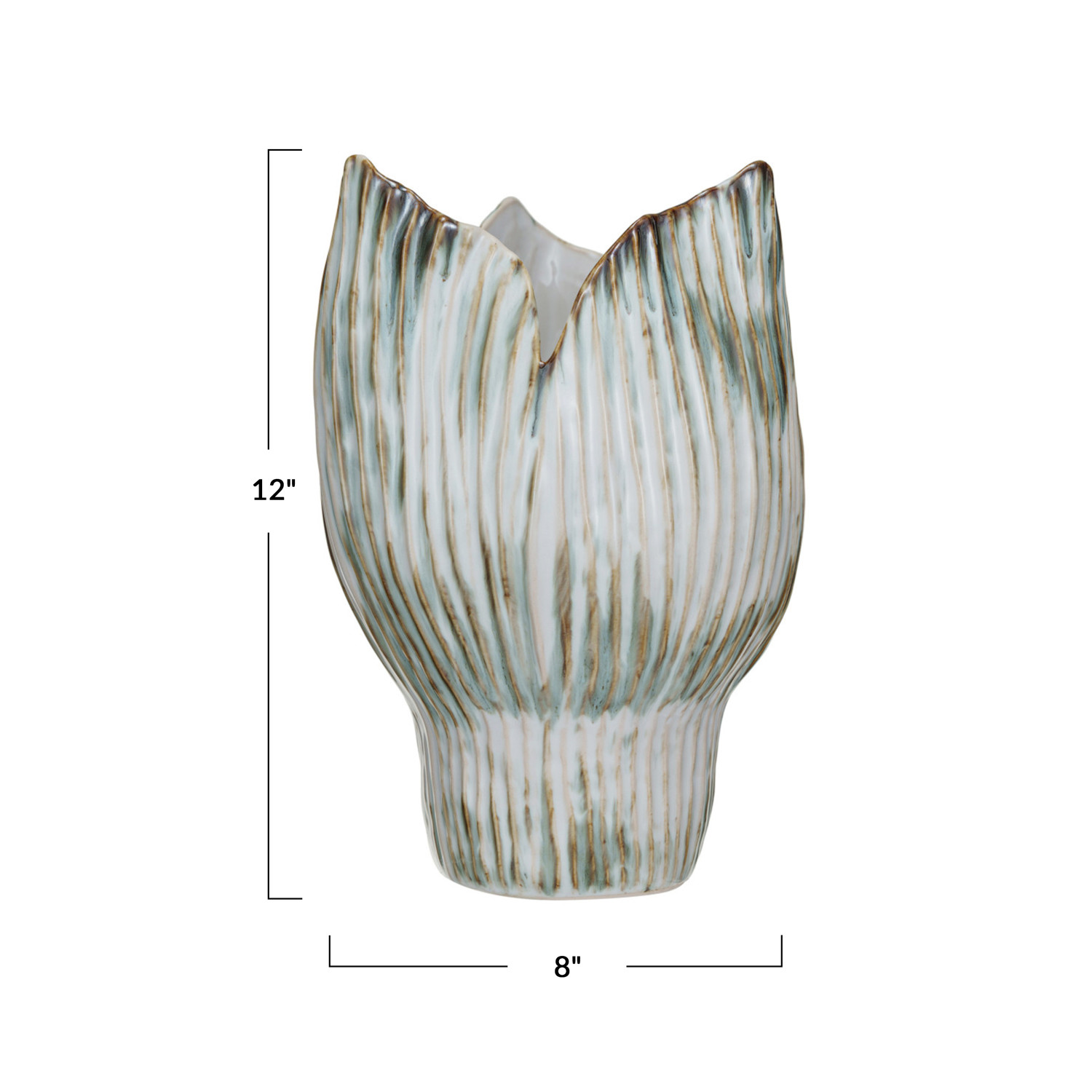 Catalog Name: 8" Round x 12"H Stoneware Pleated Sculptural Vase, Reactive Glaze, Green, Brown & White (Each One Will Vary)