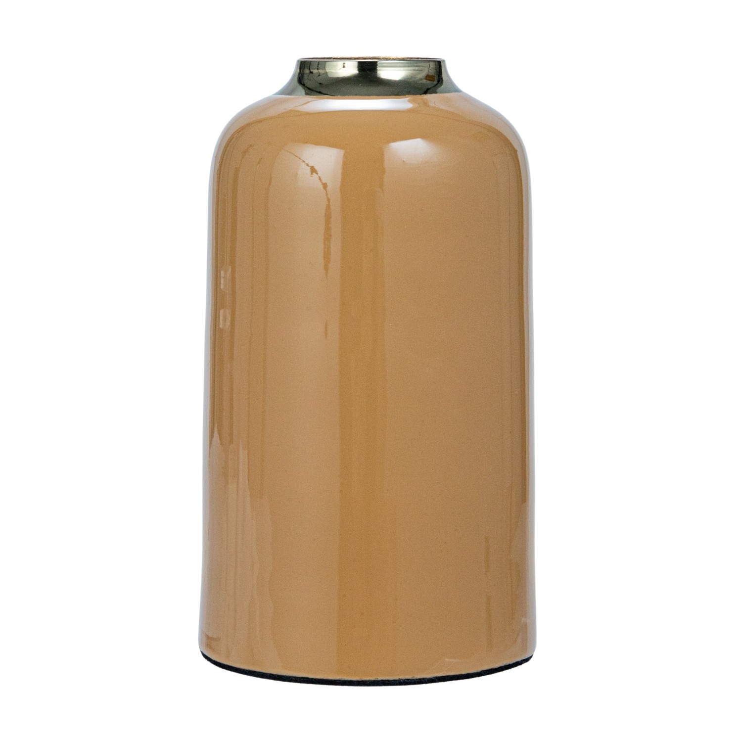 This enameled metal vase with a tan color and gold finish rim and interior is a chic and elegant home accessory. Made of strong metal, it has a round shape and narrow opening, giving it a neutral and elegant look. The gold finish rim and interior create contrast and shine. This vase can be used as a decorative accent or to hold dried or artificial flowers, plants, or branches. Place it in any room of the house, from the living room to the bedroom, and create a stylish and sophisticated atmosphere. It is suitable for Scandinavian, boho, global, modern, or French country style and adds elegance and sophistication to any space. It is a great gift for those who love art and design.