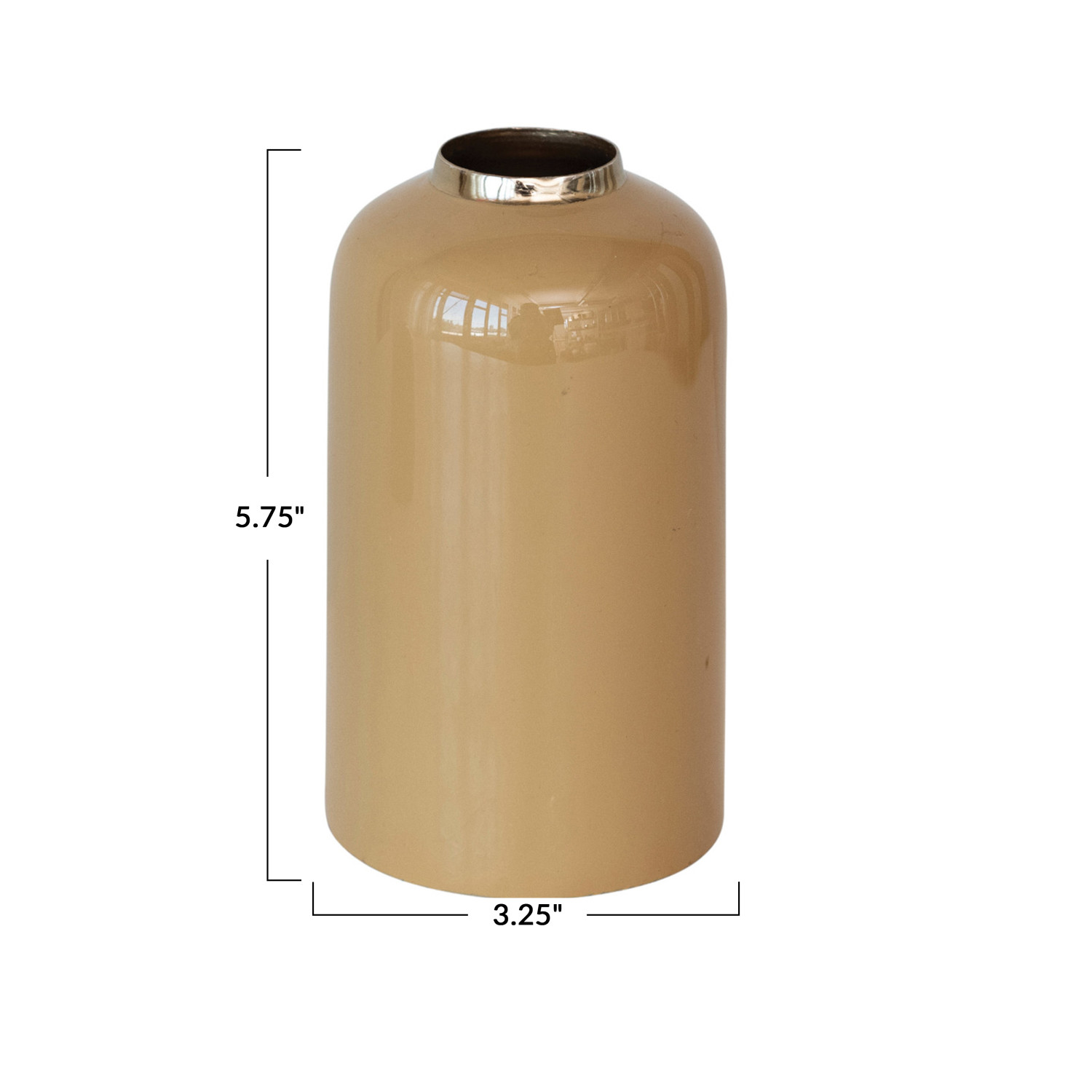 Catalog Name: 3-1/4" Round x 5-3/4"H Enameled Metal Vase, Brass Finish & Tan Color