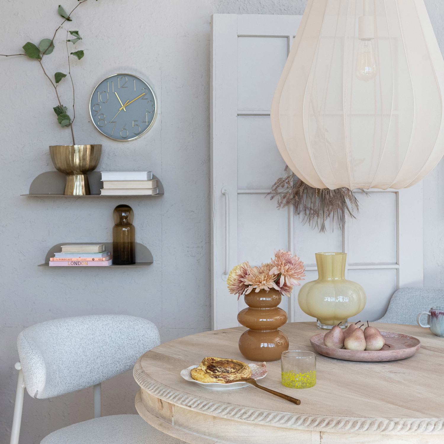 This Camel Hue Glass Vase is a masterpiece of subtle elegance, with dimensions of 5.75 inches in length, 5.5 inches in width, and 7.5 inches in height. The vase's three-layered construction creates a dynamic profile, while the 2.5-inch opening is ideal for showcasing anything from a single stem to a full bouquet. The camel color infuses the piece with warmth, complementing the vase's smooth glass texture. Designed to capture the essence of refined simplicity, this vase is a versatile addition to any decor, enhancing the space with its gentle curves and soothing palette.