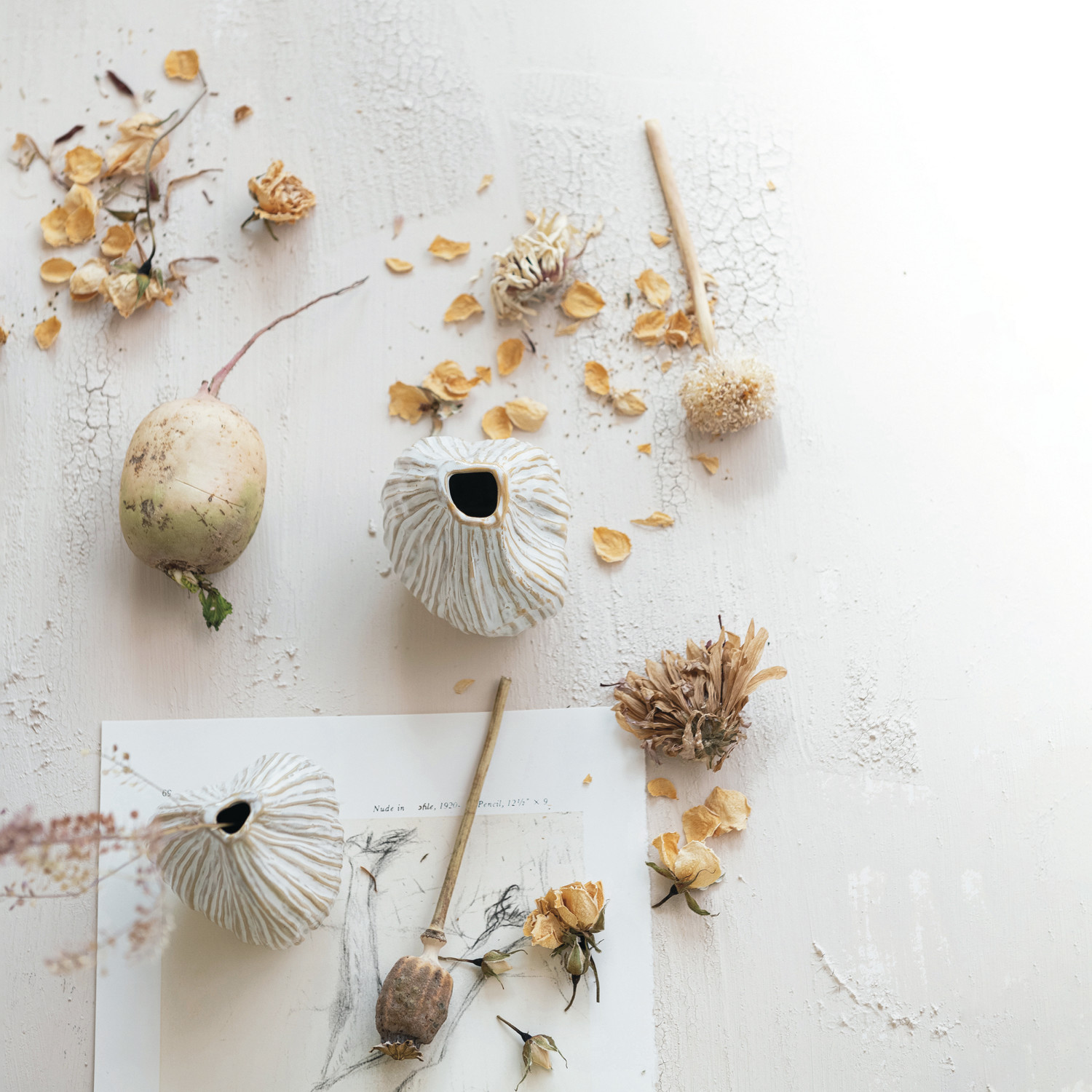 Catalog Name: 3"H - 3-3/4"H Stoneware Pleated Organic Shaped Vases, Reactive Glaze, White, Set of 3 (Each One Will Vary)