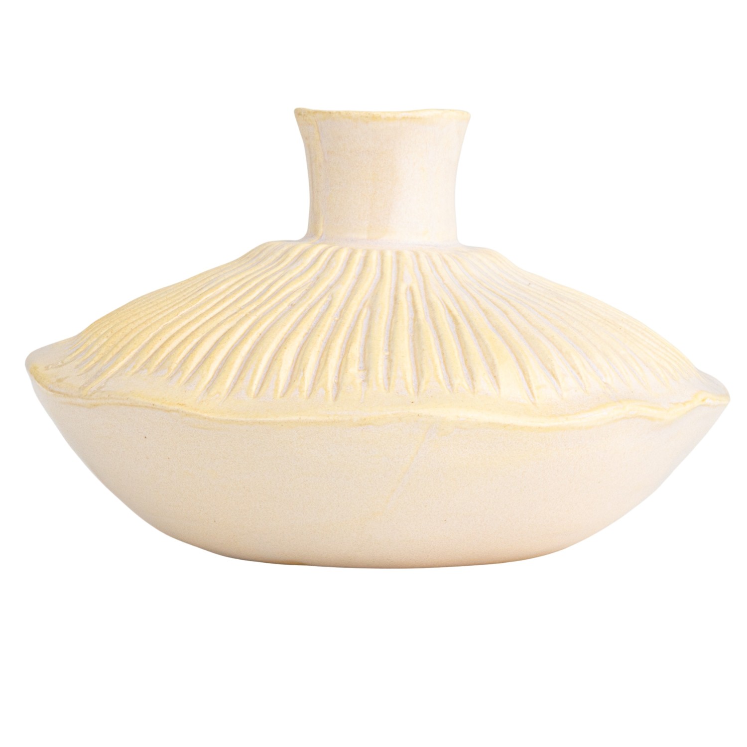 Catalog Name: 7-1/4" Round x 4-1/2"H Stoneware Pleated Vase, Reactive Glaze, Cream Color (Each One Will Vary)