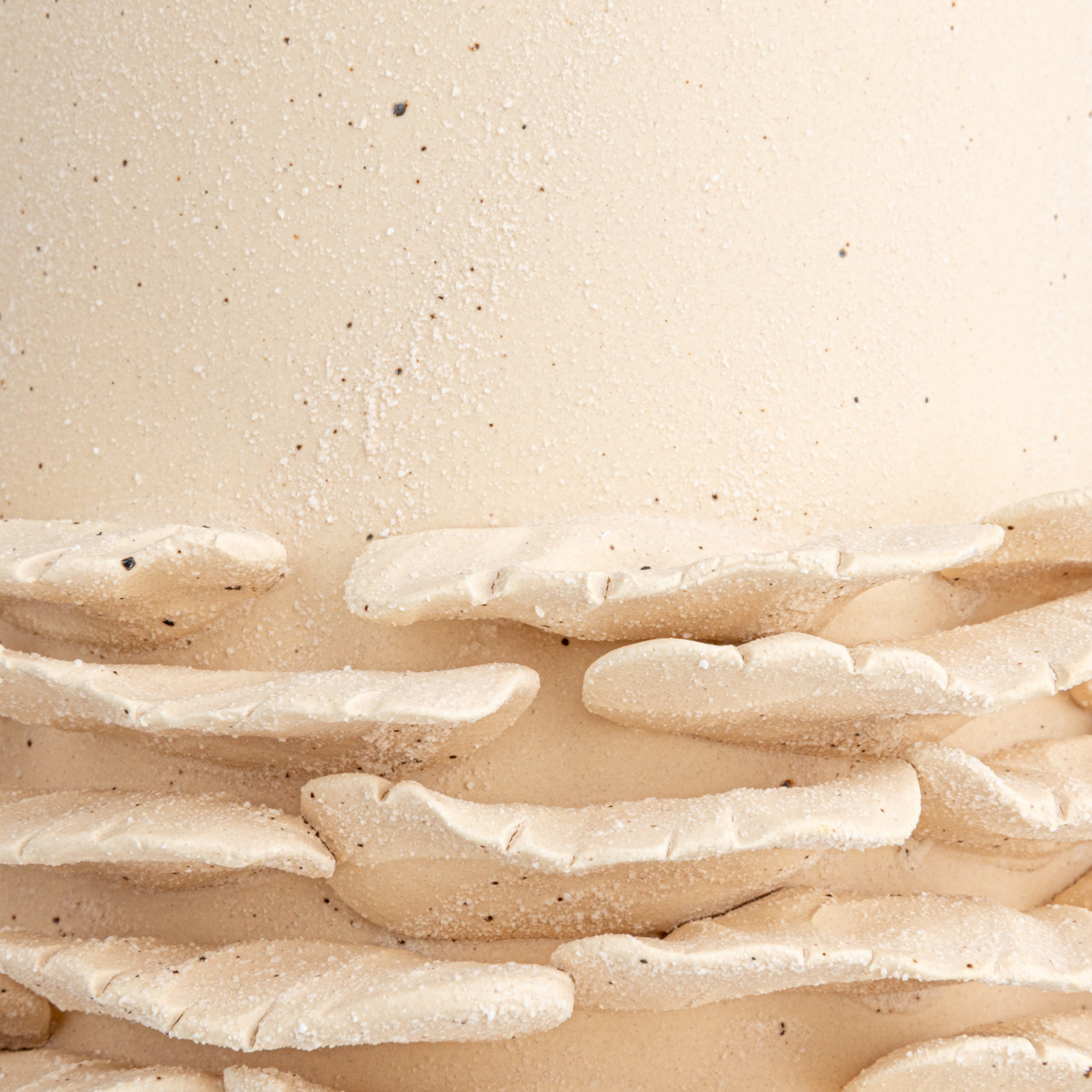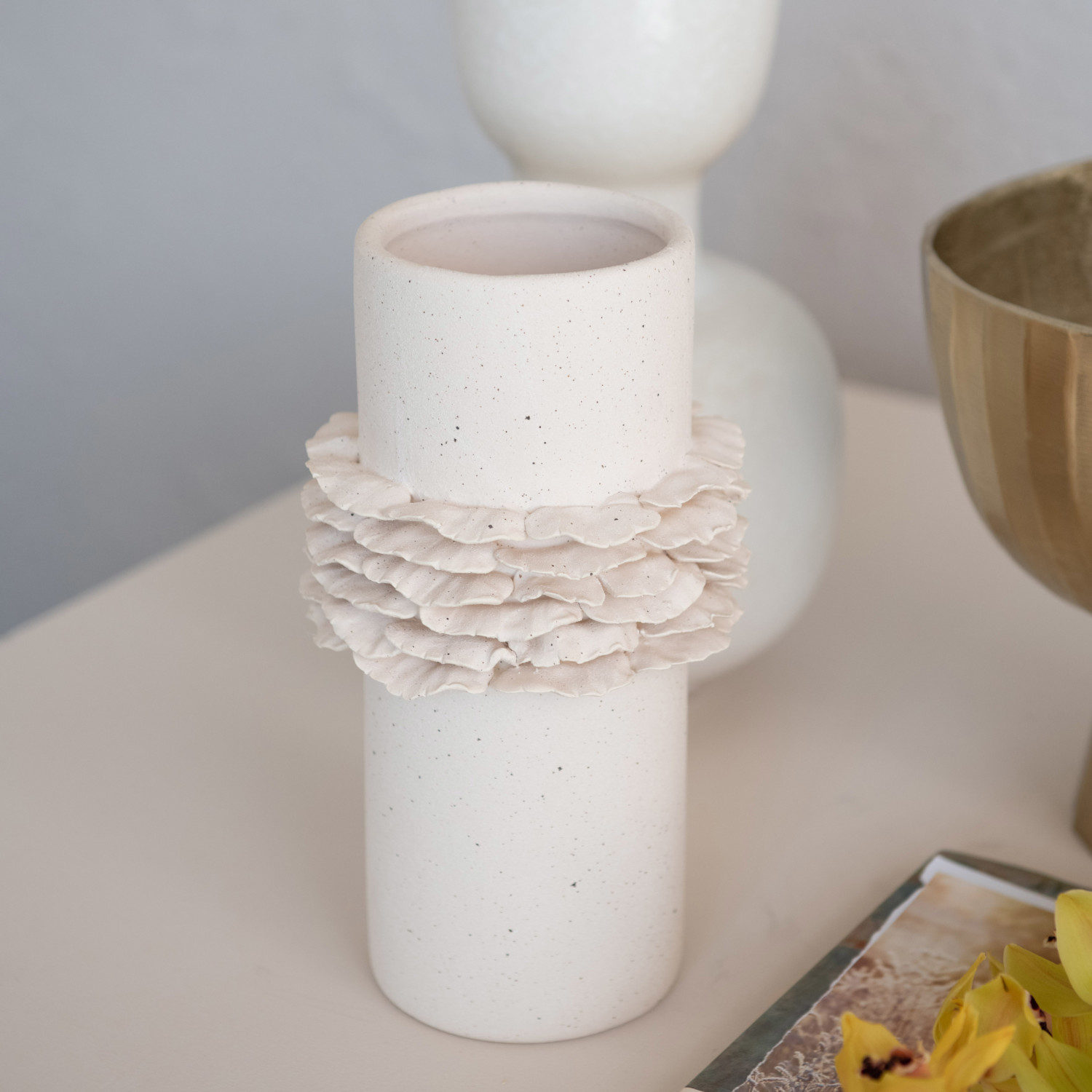 Catalog Name: 5-1/2" Round x 10"H Stoneware Vase w/ Ruffles, Matte Cream Color Speckled